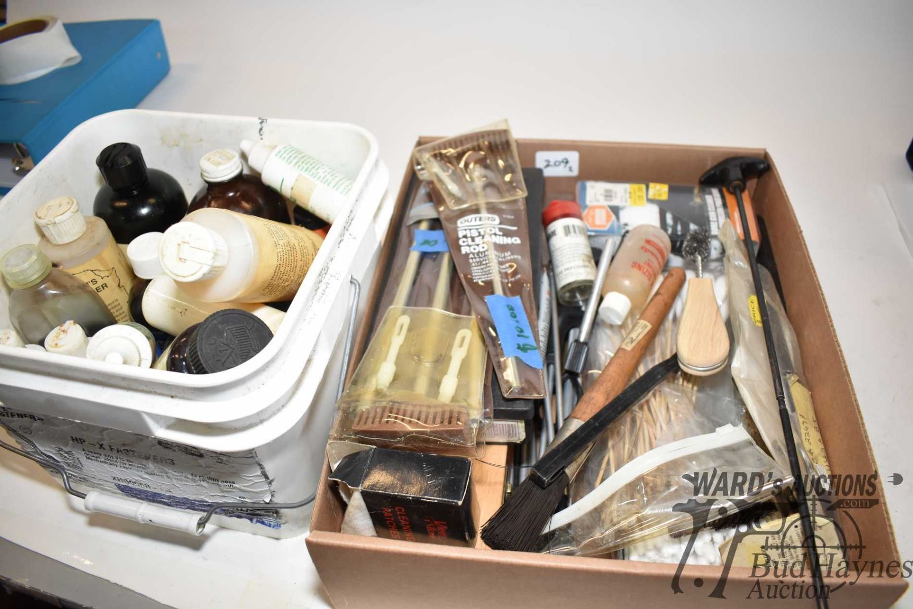 Selection of cleaning tools including cleaning kits, large Q-Tips, bore snakes, wire brushes and selection of fluids and lubricants