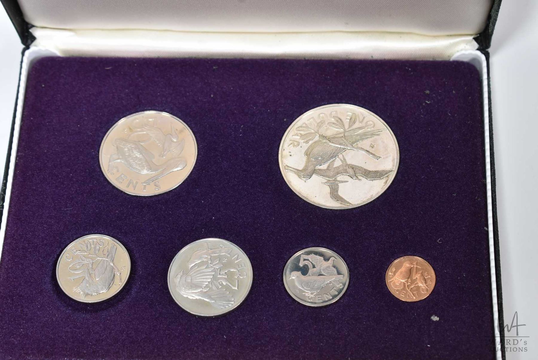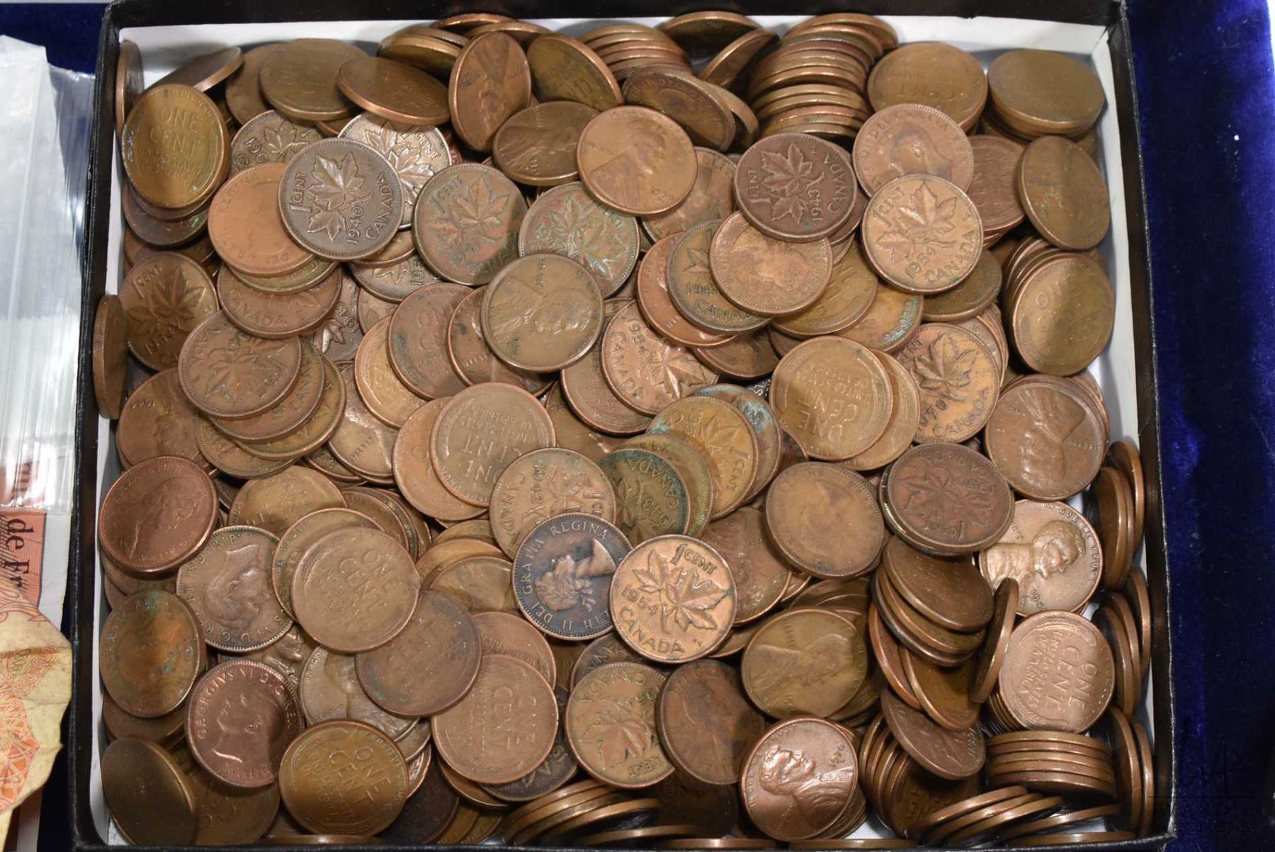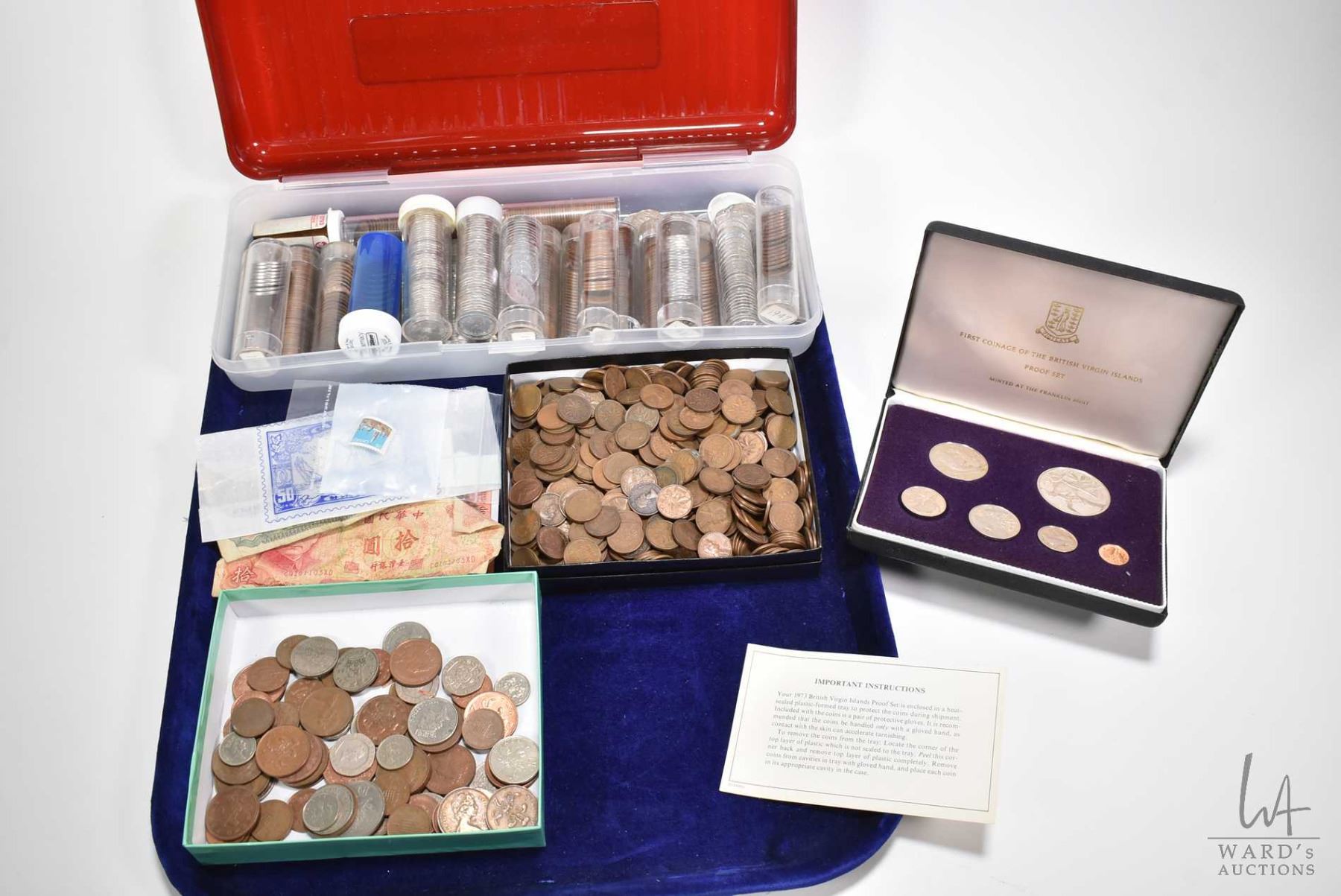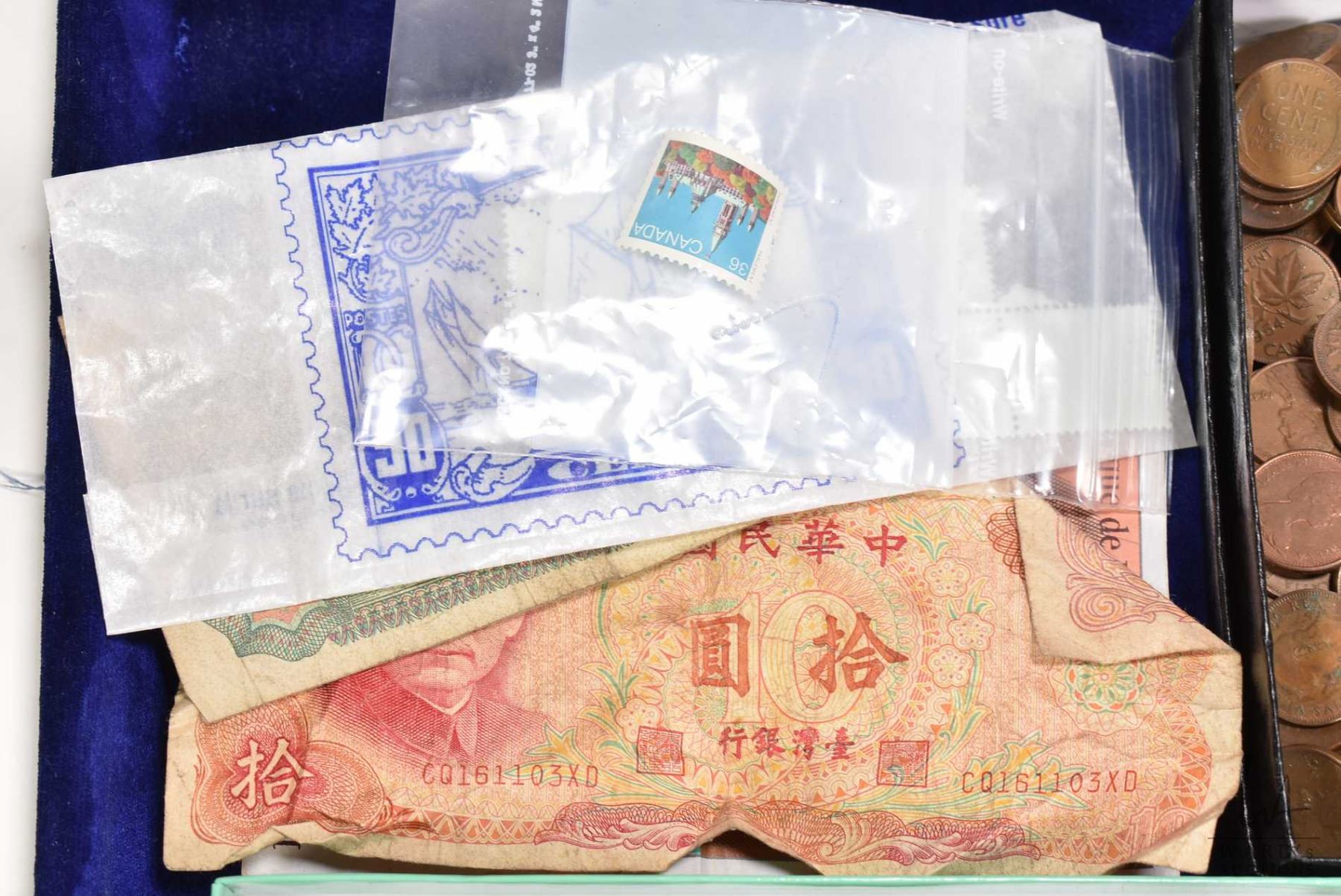 Selection of coins and stamps including foreign bills and coins plus British Virgin Islands proof set for 1973 and a large selection of mostly Canadian nickels, dimes and pennies etc.