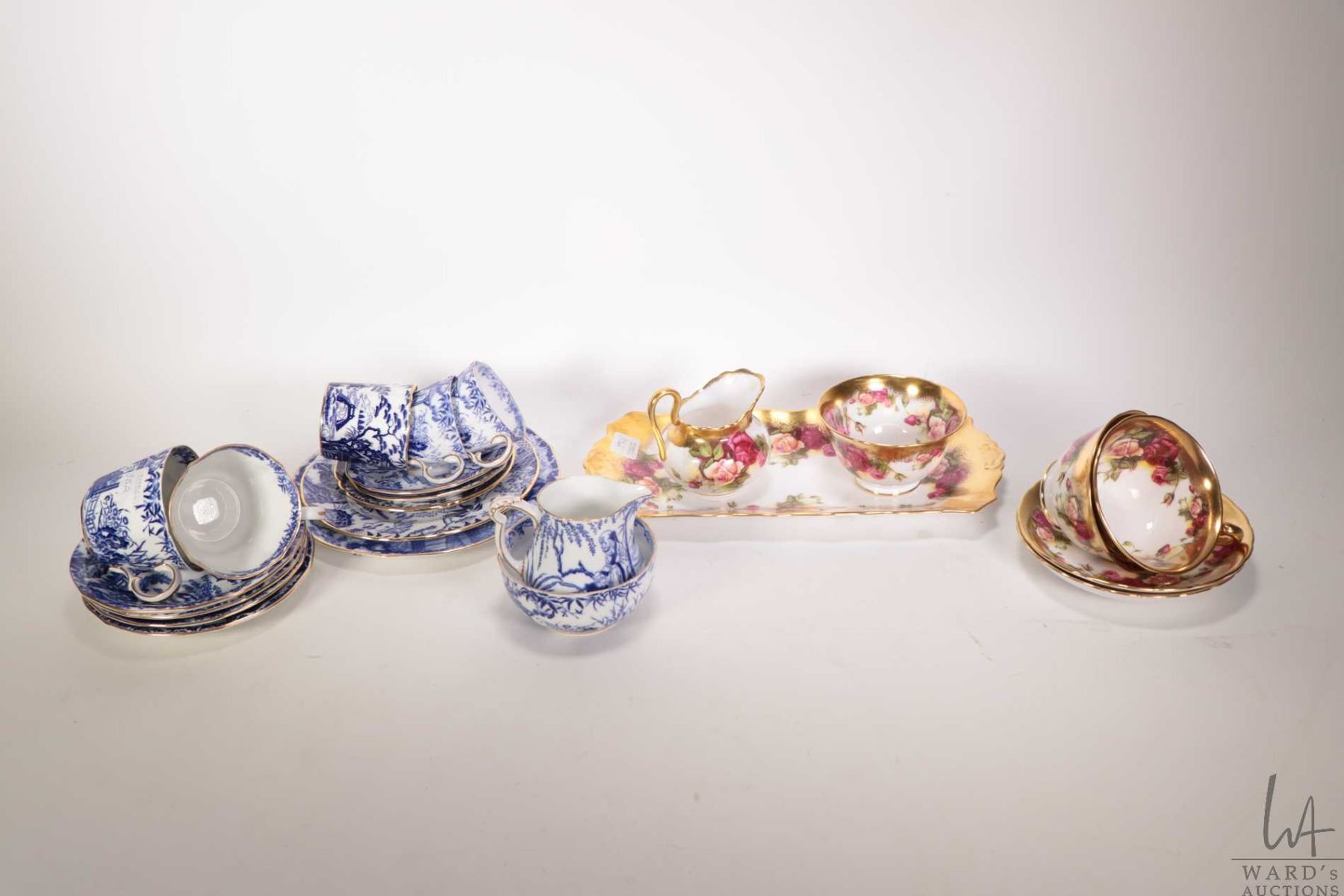 Selection of collectible china including Royal Crown Derby Mikado; three demitasses and saucers in two styles, two teacups with four saucers and cream and sugar plus a selection of Royal Chelsea Golden Rose including two teacups and saucers, cream, sugar and tray. Note: Not Available For Shipping. Local Pickup Only