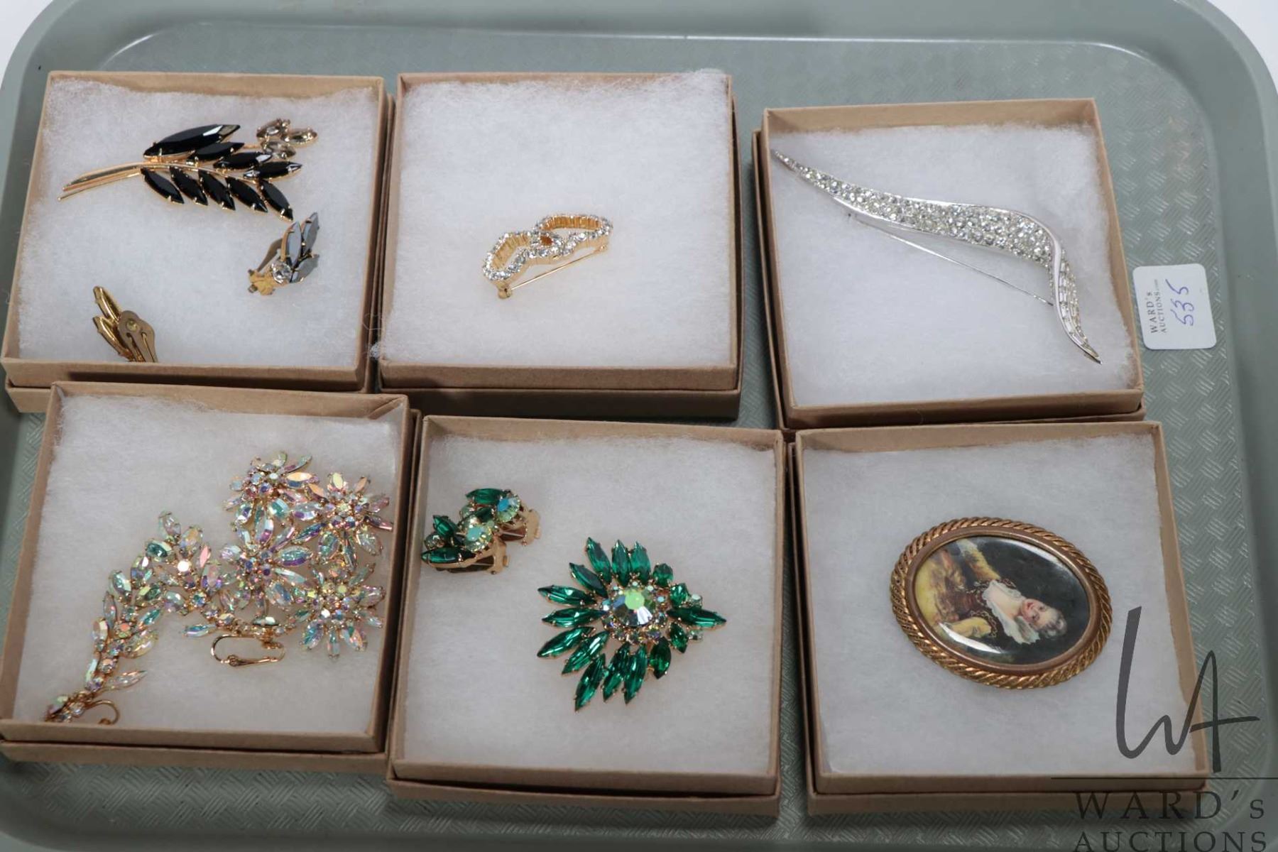 Selection of collectible costume jewellery including hand painted brooch with artist signature, signed Lec Le Couturier brooch, D'Orland, plus three "Sherman style" brooch and earrings sets