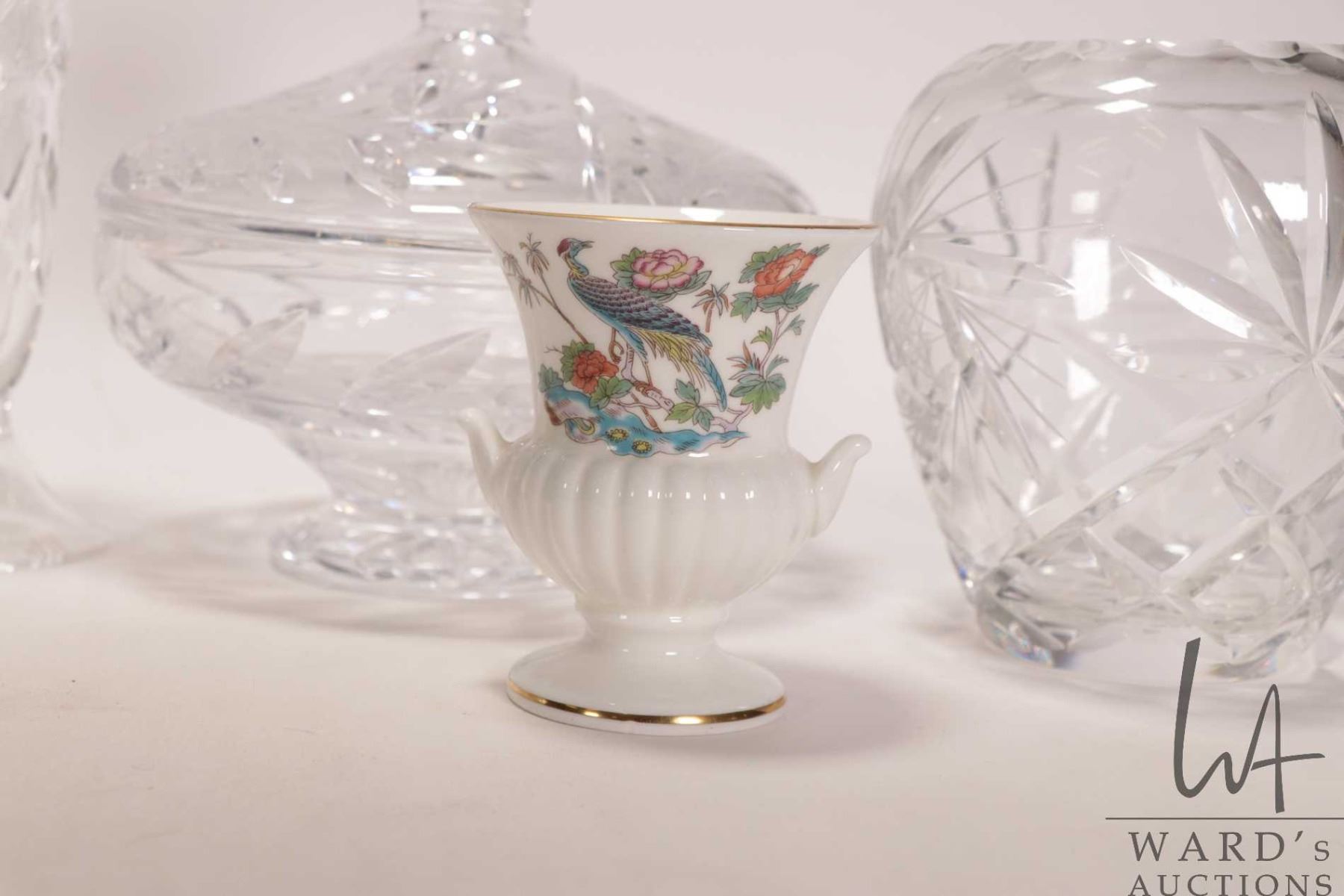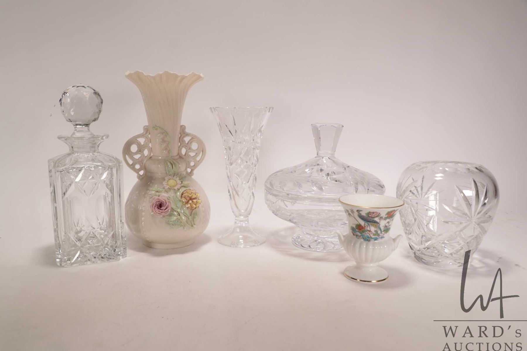 Selection of collectible crystal and porcelain including Belleek Princess vase with hand applied floral details 9" in height, Wedgwood 3 1/2" urn, small crystal decanter, lidded dish and two vases