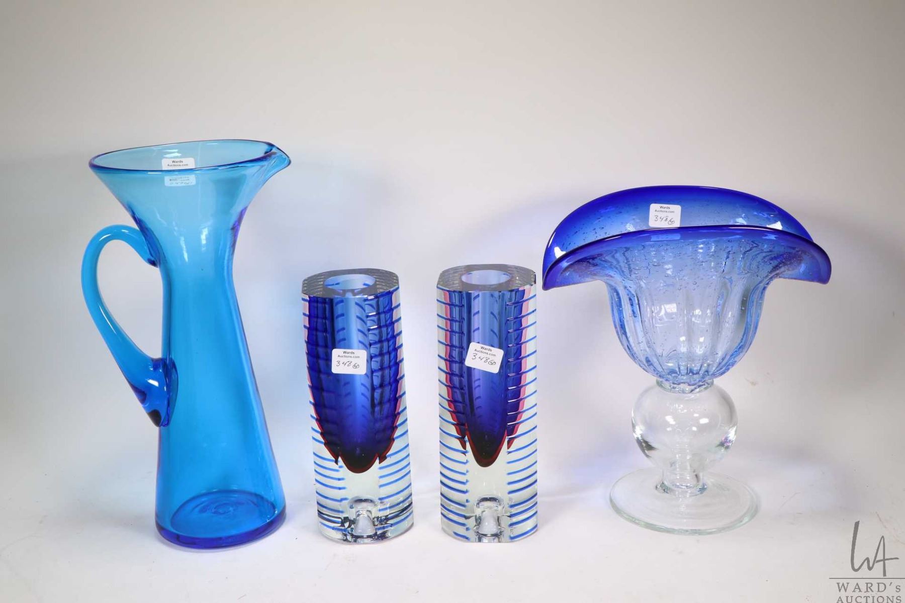 Selection of collectible glass including a pair of convertible candlestick/vases in cobalt, a artisan made colourless to cobalt 10" art glass pedestal dish and a 12" blue glass ewer