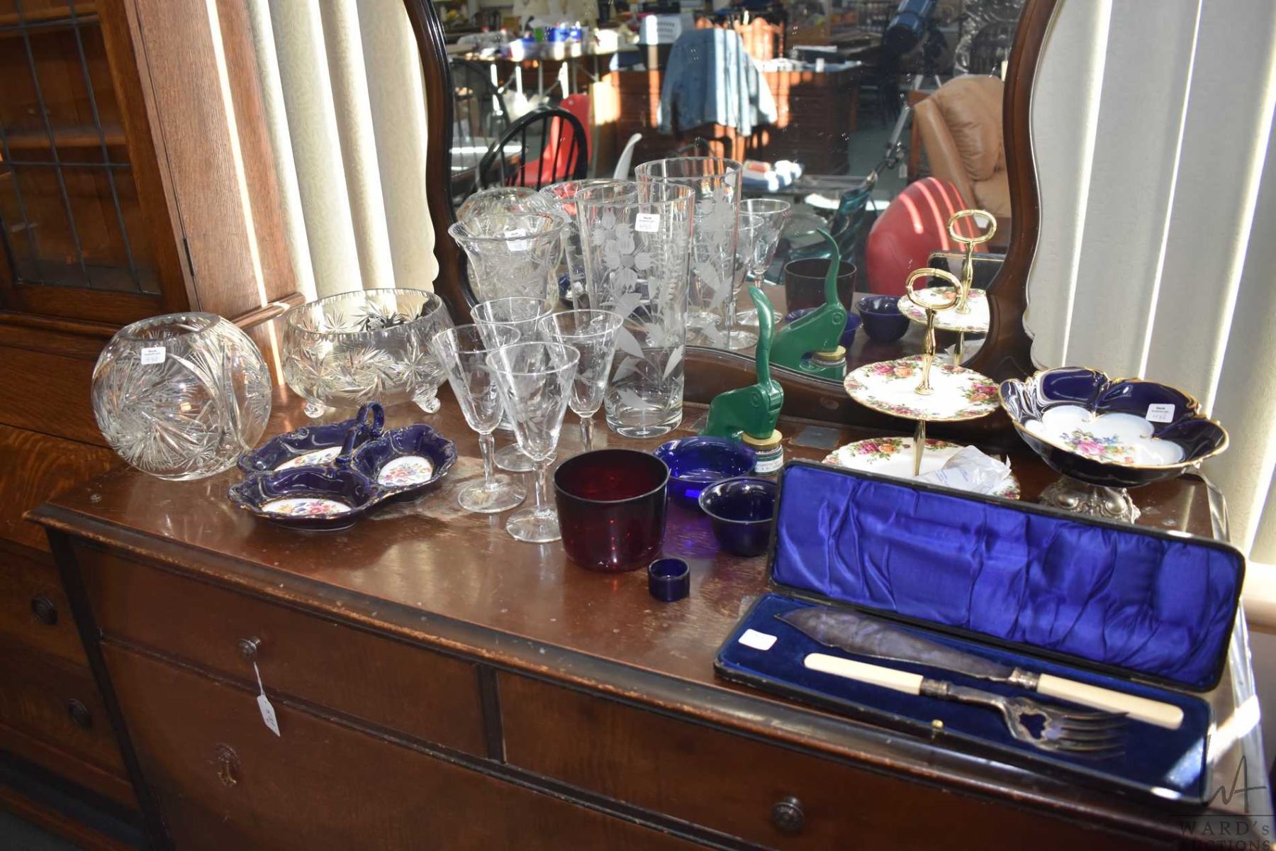 Selection of collectible including Old Country Roses tiered cake plate, corporate seal, crystal rose bowl and footed bowl, Cornflower crystal vase and four claret glasses, cobalt divided server, silver-plate boxed fish server set, cobalt glass liners etc.- note no shipping