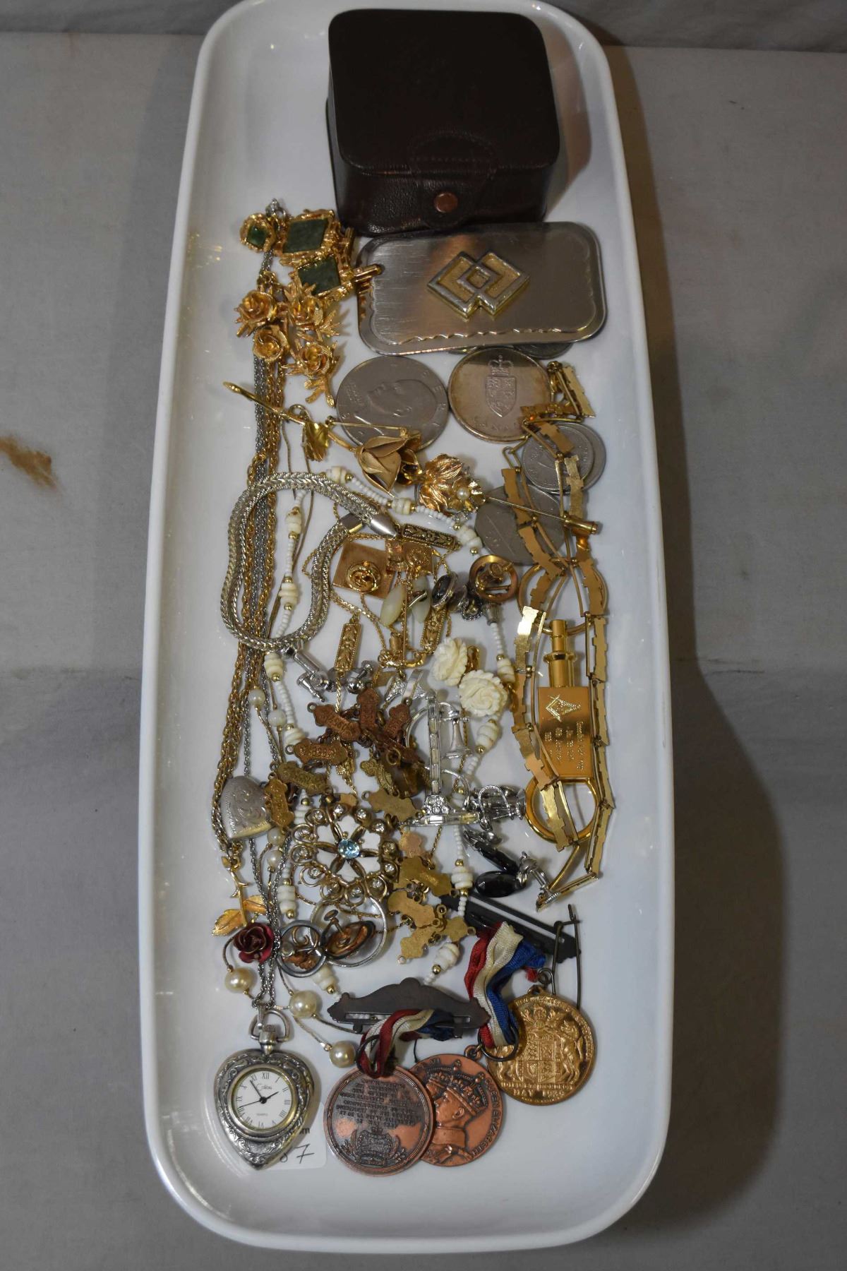 Selection of collectible jewellery, coins and medallions including gent's cufflinks and tie pins, sterling silver bracelet, ring, Coronation medallions. St. John's Ambulance medallions, coins including 1977 American liberty dollar, Canadian confederation coin, foreign coins, signed Cora brooch etc.