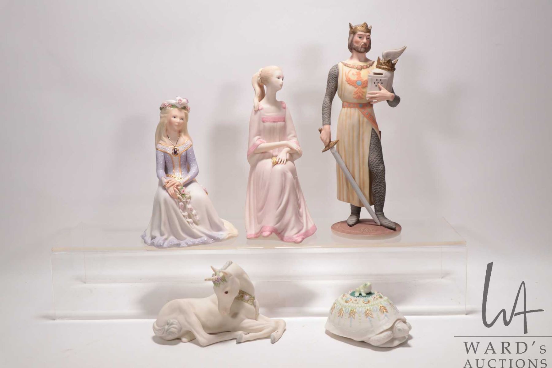 Selection of collectible porcelain including King Arthur and Prudence plus three pieces of Cybis porcelain including unicorn, turtle and figure on a young girl NOTE: SHIPPING IS NOT AVAILABLE, LOCAL PICK UP ONLY