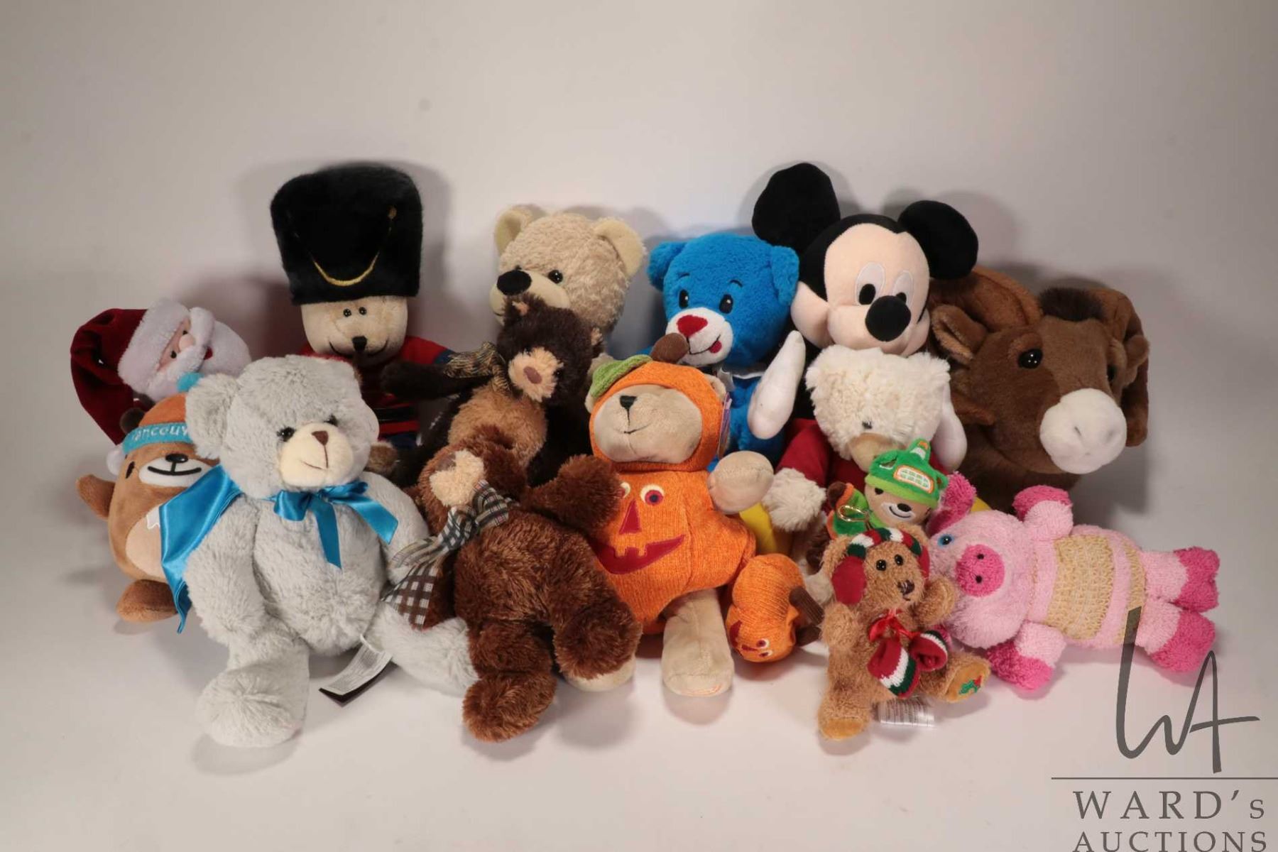 Selection of collectible stuffies including Hudson's Bay bear, Bearington, Vancouver Olympics, Gund, Disney, Starbucks etc.
