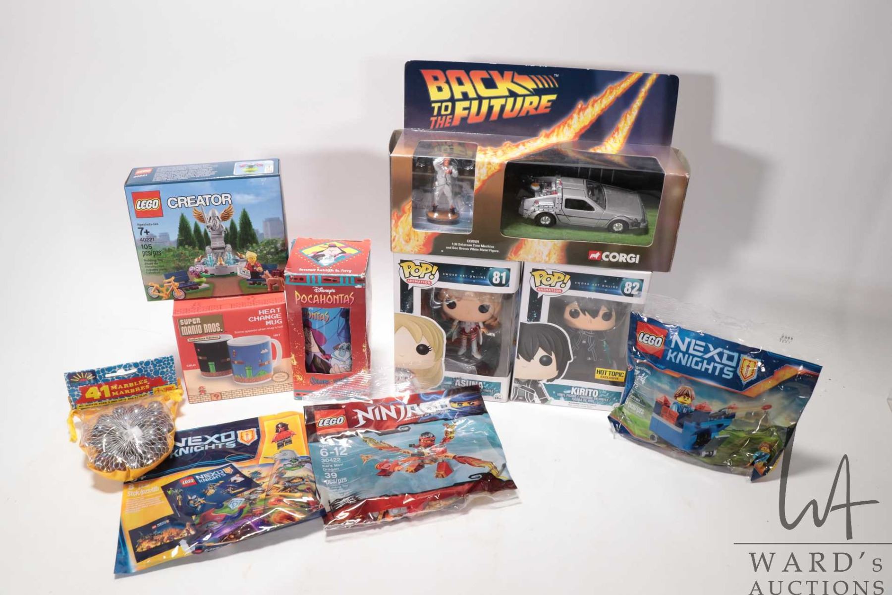 Selection of collectible toys including Lego Knights, Lego Creator, Back to the Future car & figure in box, two POP animation figures, Super Mario Bros. heat changing mug in box, Pocahontas drinking glass in box and a bag of marbles