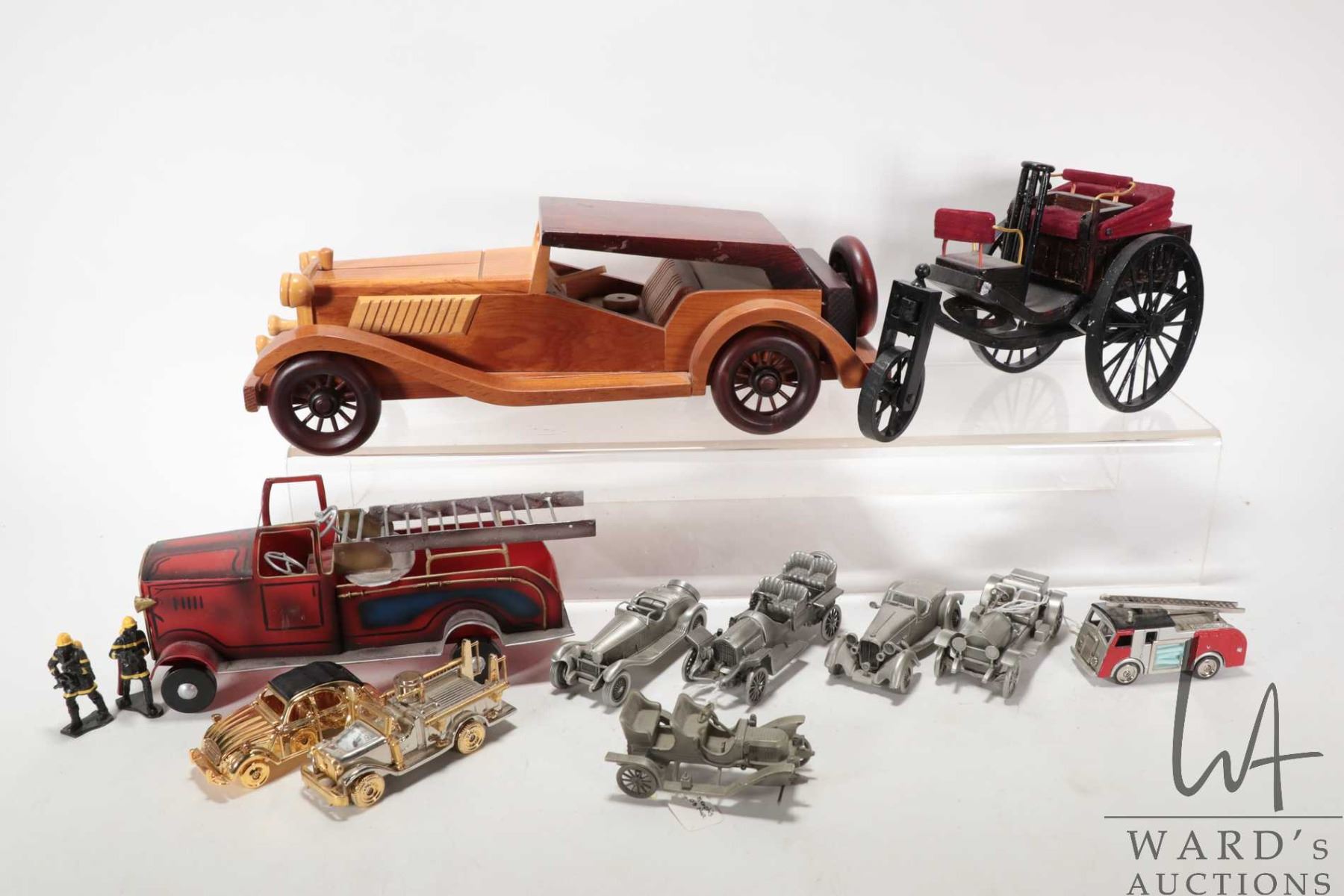 Selection of collectible vintage style cars including Danbury Mint pewter, cars with clocks etc. and three hand crafted cars