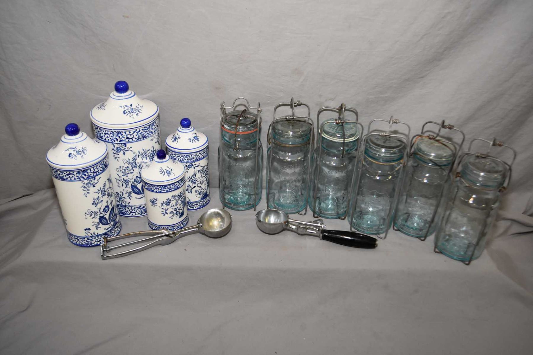 This Item Not Available For Shipping. Local Bidders Only. Selection of collectibles blue and white graduated cannister set and six lidded sealers plus two vintage ice cream parlour scoops