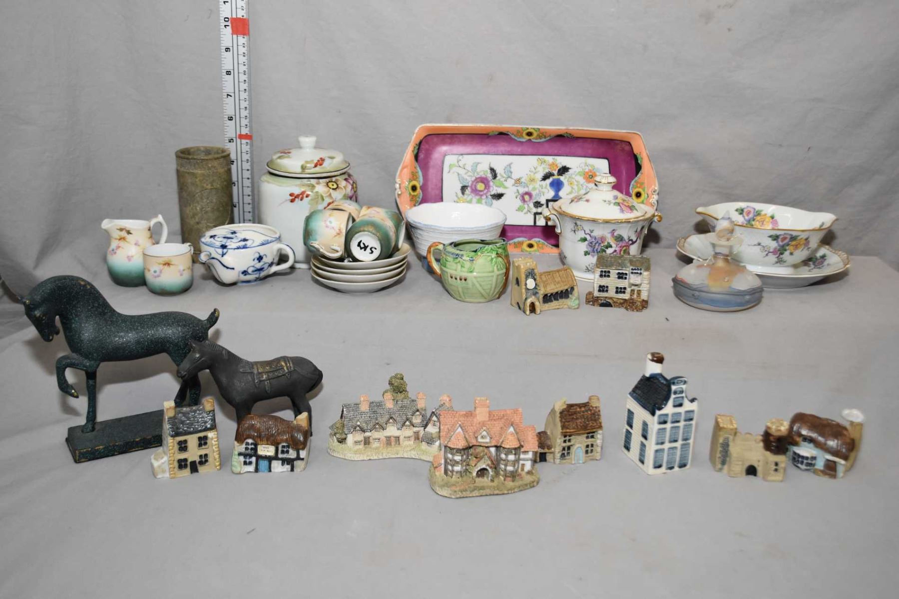 This item is not available for shipping. Local pickup only. Selection of collectibles including Japanese stone brush holder, small lidded barrel, set of four demis, plus art glass perfume, plus English made cottages, small brass horse etc.