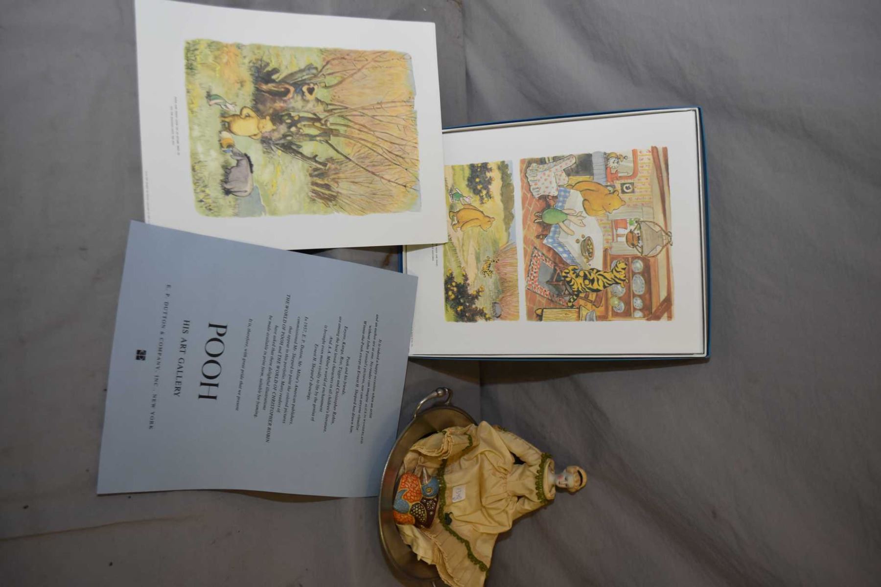 Selection of collectibles including "Pooh- His Art Gallery" featuring the coloured illustrations of E.H. Shepard, eight in total in original presentation box and a bisque head doll, small Oriental match holder and an antique pewter double handled dish