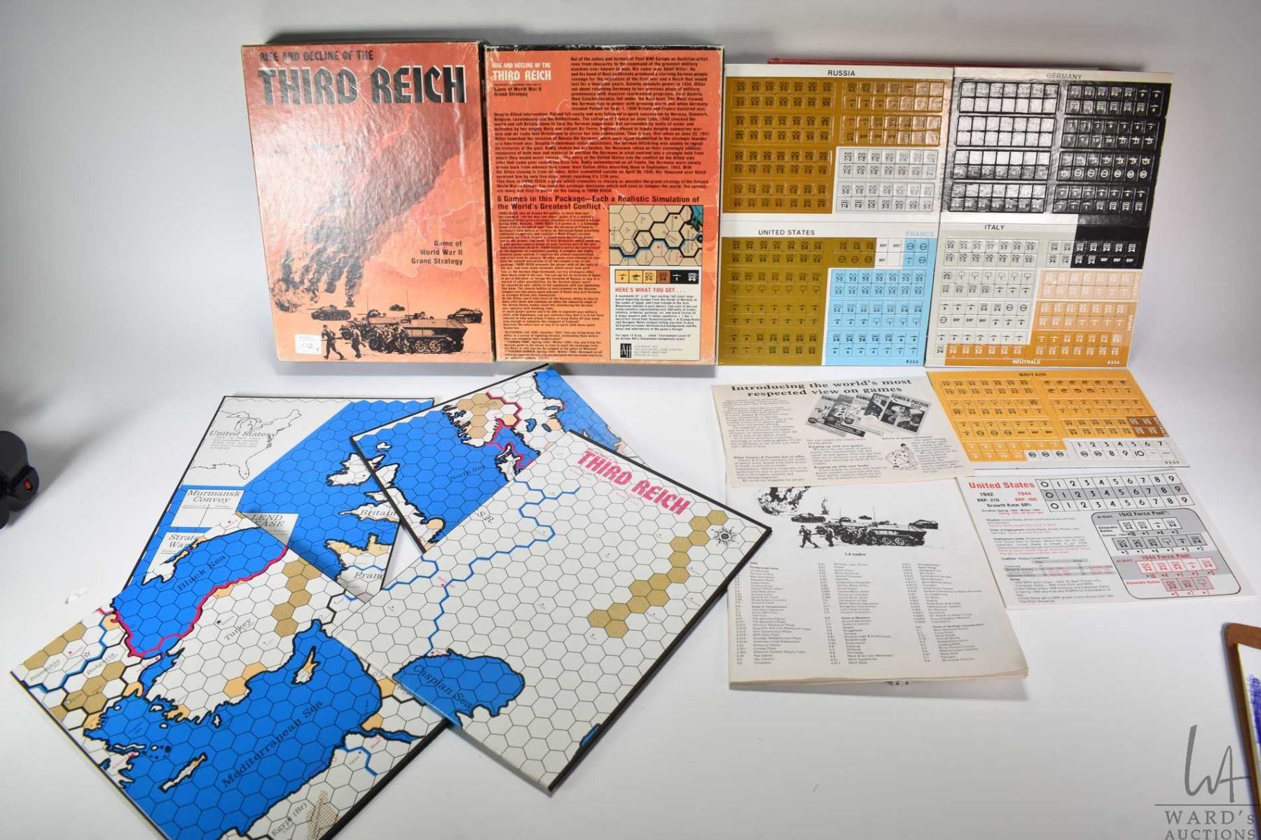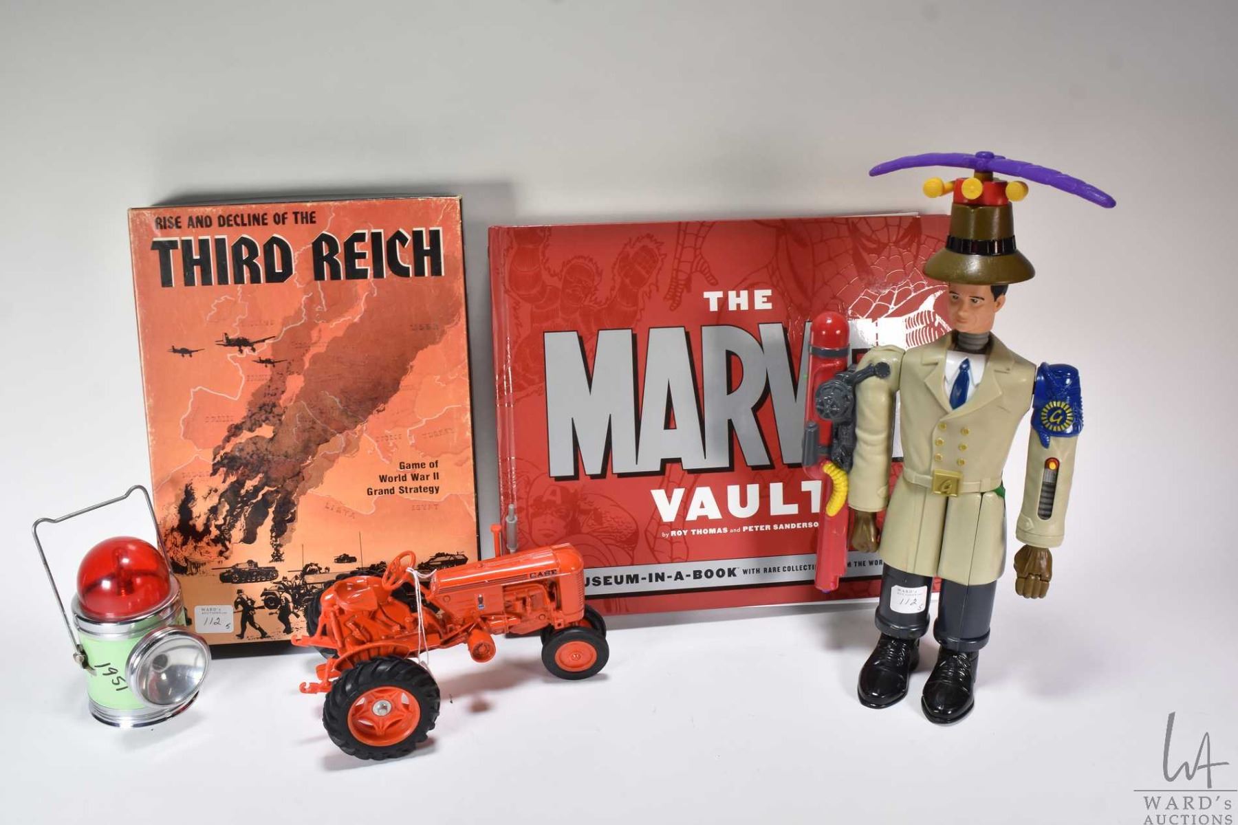 Selection of collectibles including The Marvel Vault ; A museum-in-a-book by Roy Thomas and Peter Sanderson book, a vintage Rise and Decline of the Third Reich boxed board game, a Inspector Gadget doll with accessories and a cast metal Case tractor plus a Japanese tin toy lantern