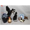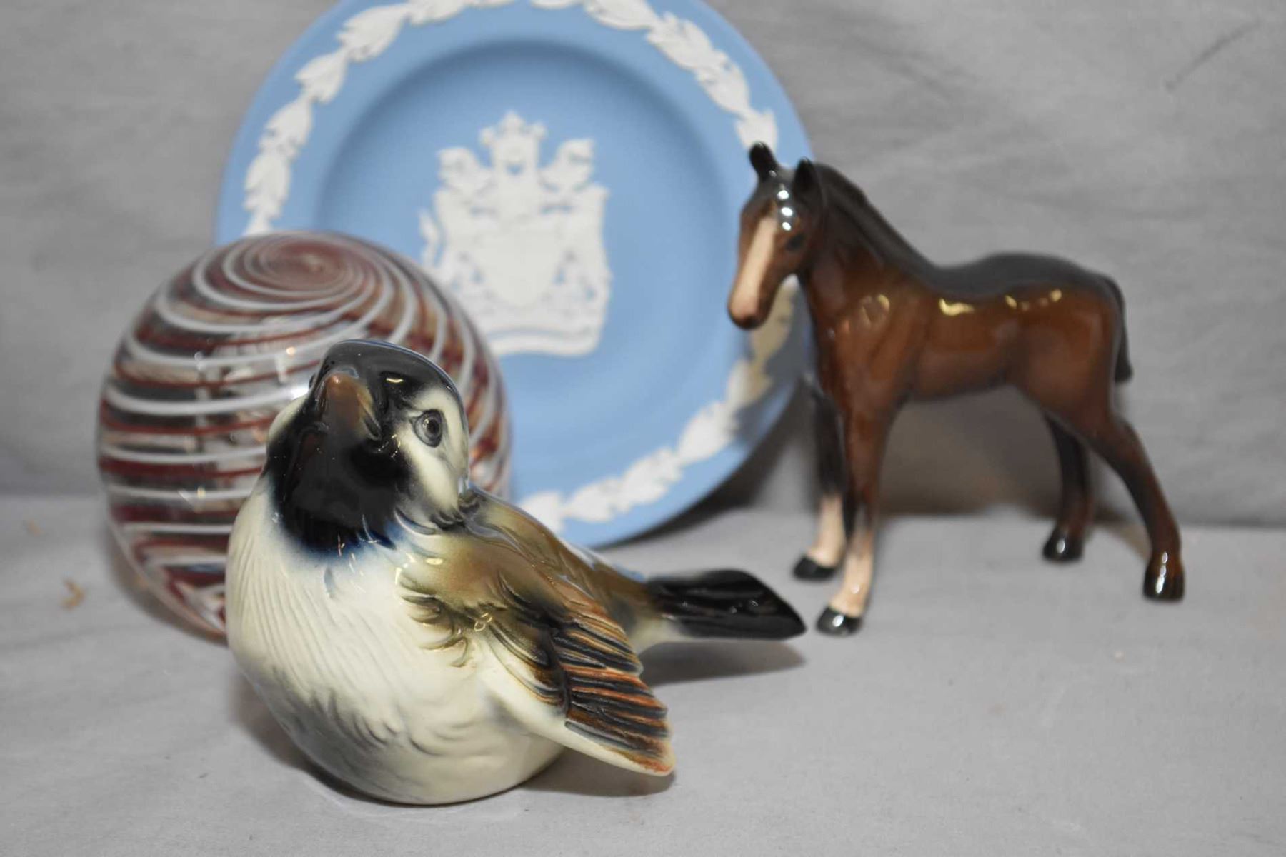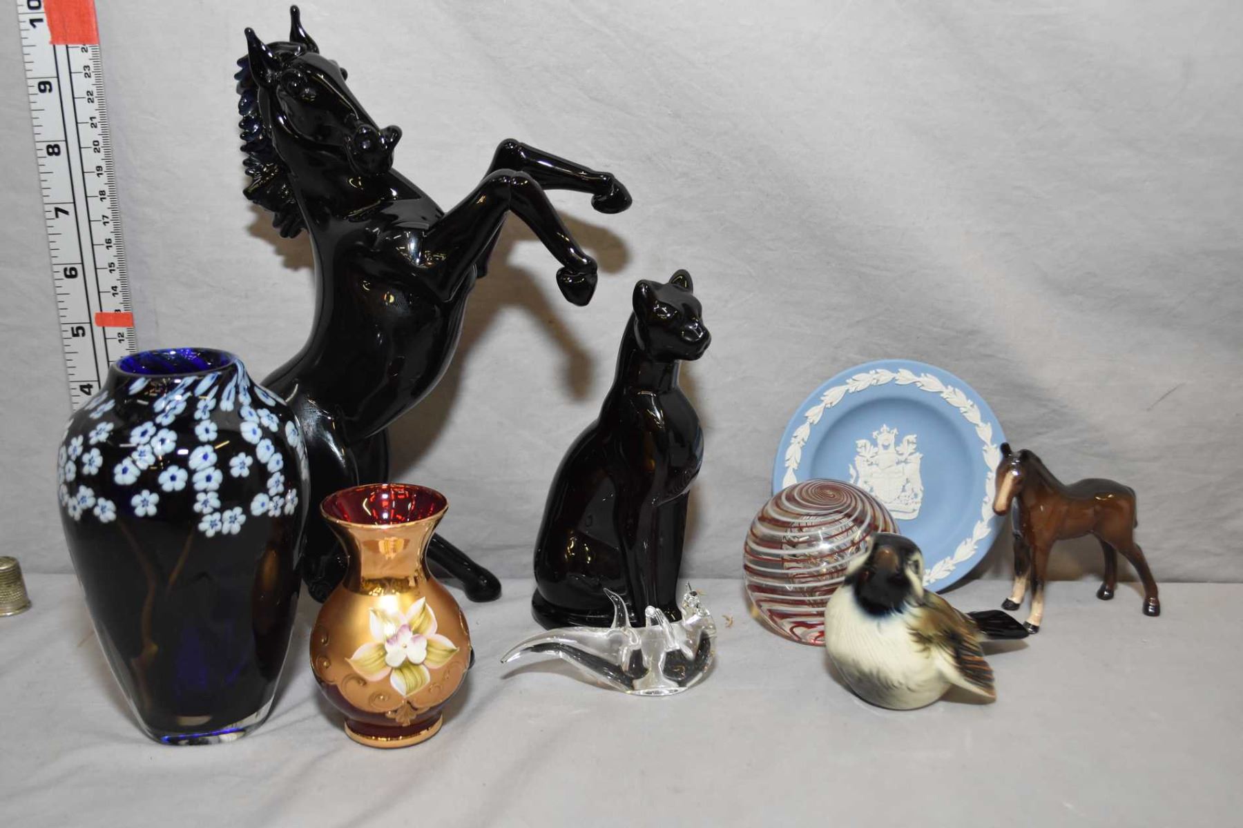 Selection of collectibles including art glass horse signed by artist plus glass cat, signed vase, plus paperweight small Beswick horse, Gobal bird etc.