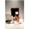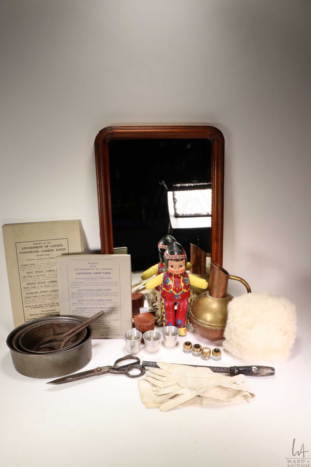 Selection of collectibles including brass and copper ewer, fur muff with zipper pouch, pair of long kid leather ladies glove, leather doll, set of three graduated cake tins, two packages of carbon paper, portable cup in leather case, set of shears etc.