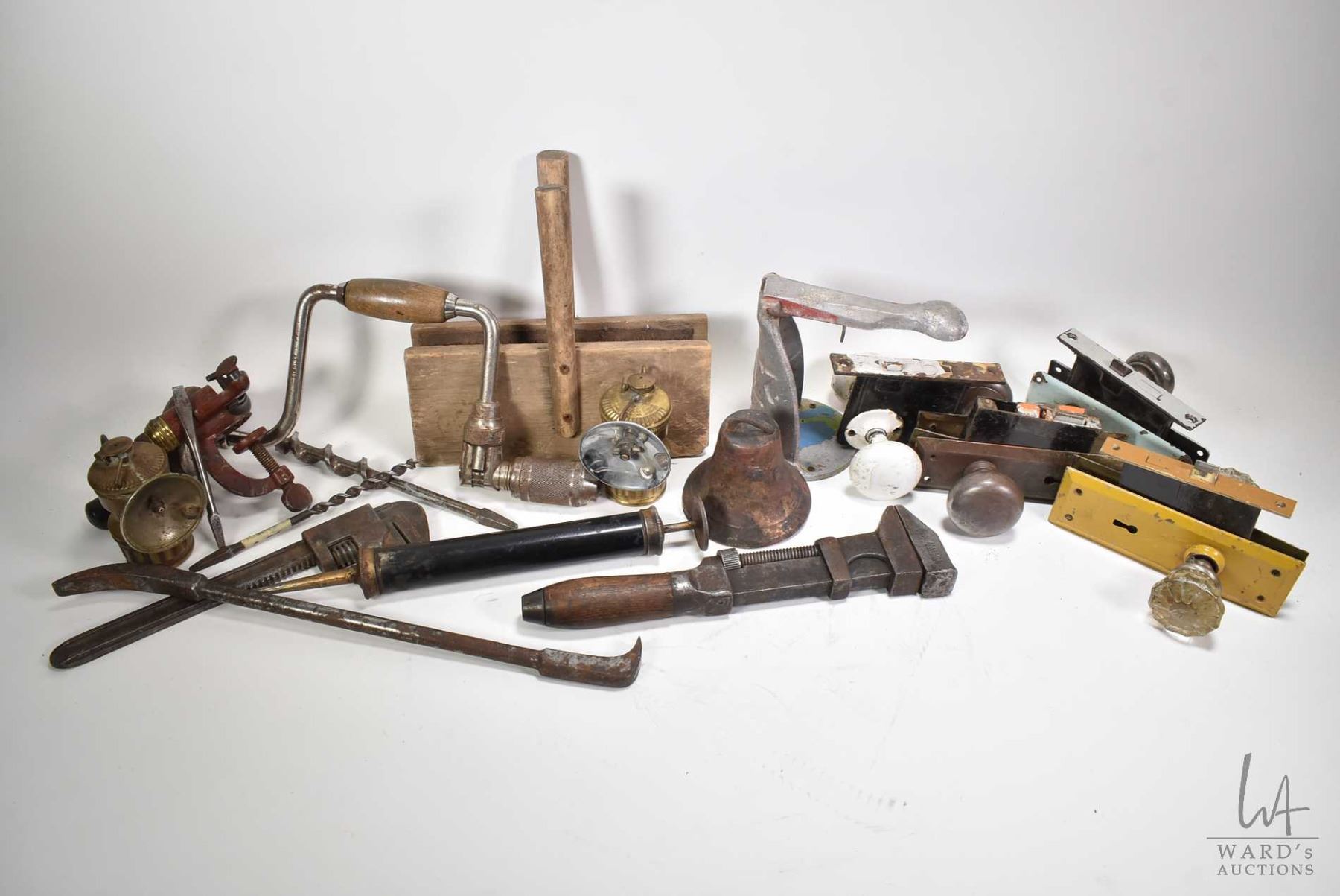 Selection of collectibles including door passage sets, glass, stainless and porcelain, miner's lamps, auger and bits, adjustable wrenches, bell, wool carders etc.