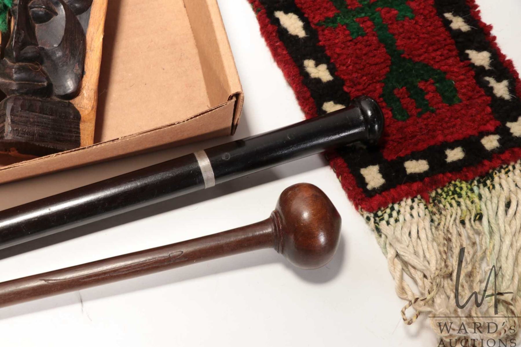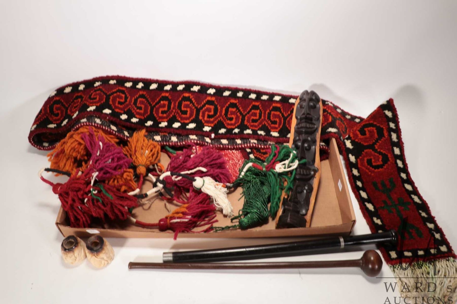 Selection of collectibles including ebony wood carving, knife/ wood shield and club, pair of Meerschaum candlesticks, pair of beaded curtain tassels and a Yuhurt wool wall hanging 6" X 12"