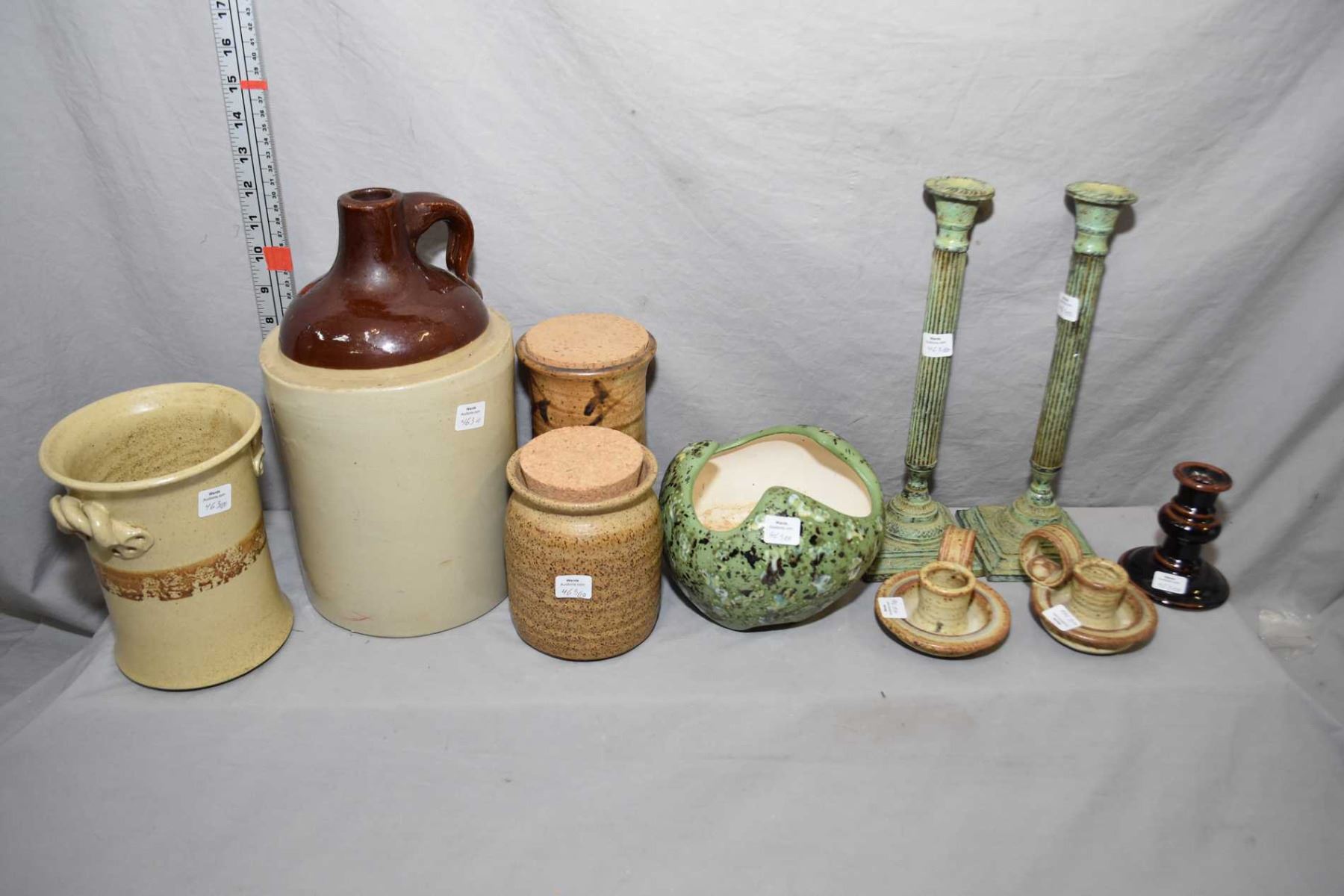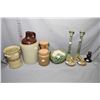 This item is not available for shipping. Local pickup only. Selection of collectibles including glazed pottery, stoneware jugs, pair of candleholders etc.