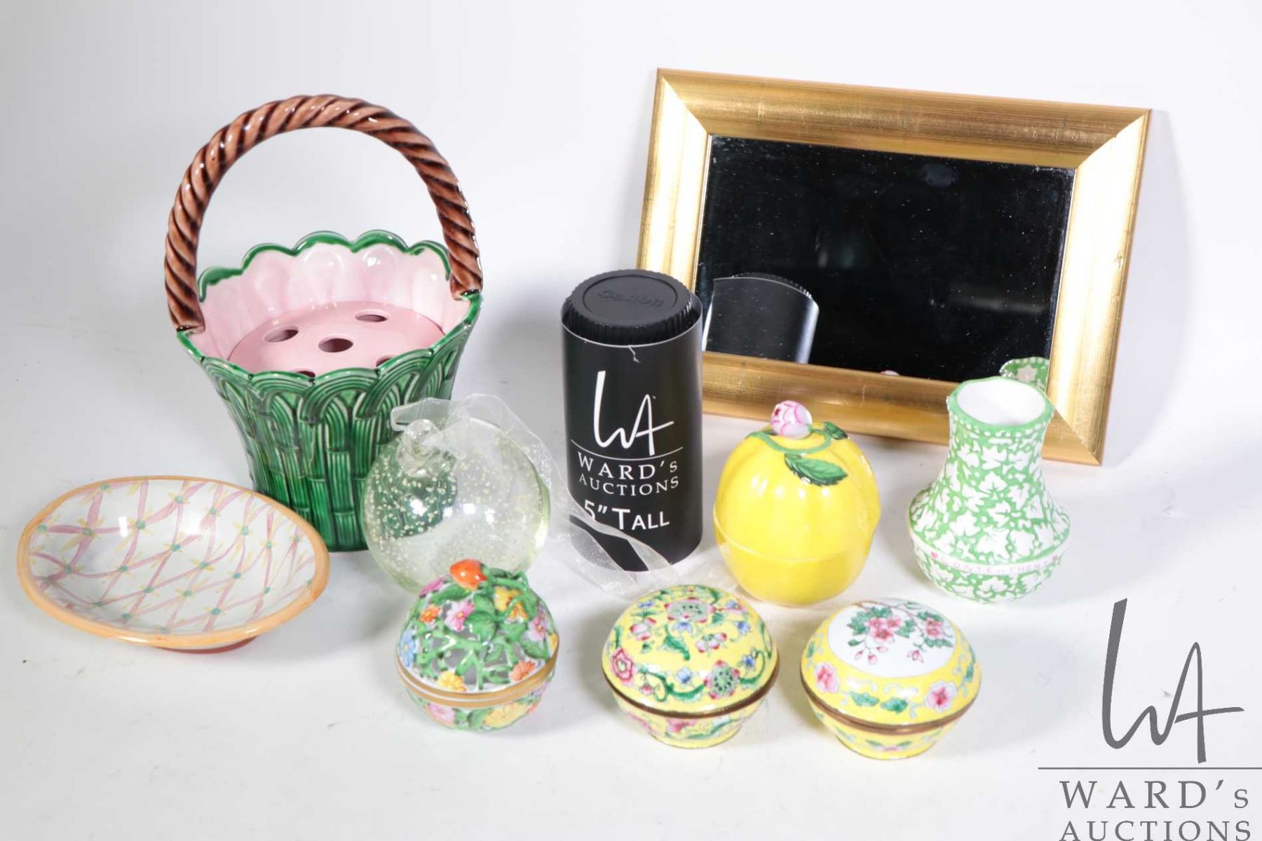 Selection of collectibles including hand blown art glass ball, glazed semi porcelain flower basket with frog, hand painted lidded enamel trinket boxes, Hungarian hand painted porcelain potpourri etc. Note: Not available for shipping. Local pickup only