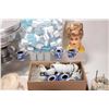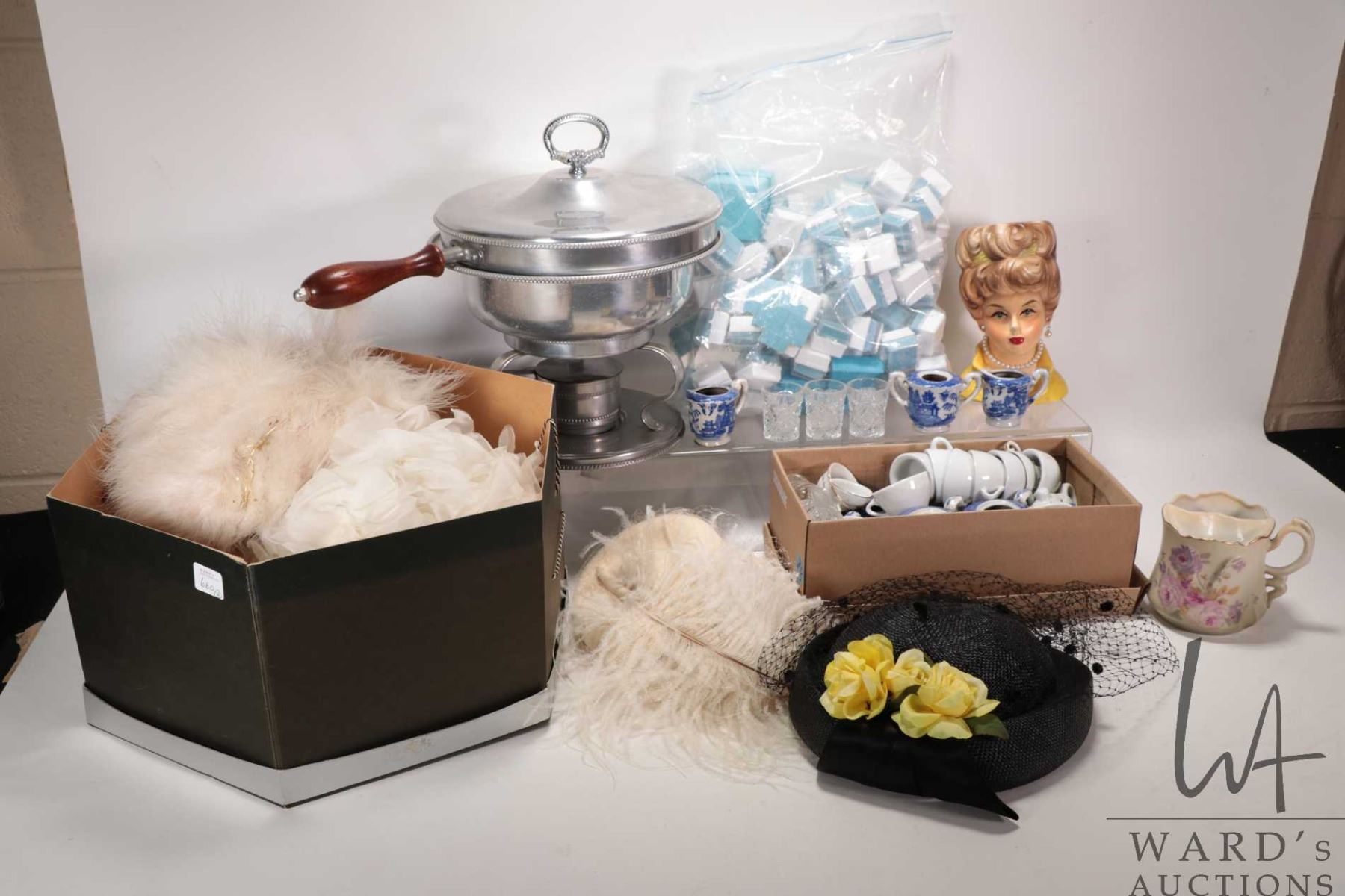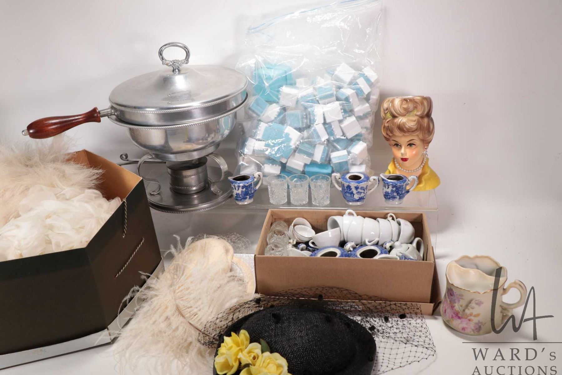 Selection of collectibles including hat box with hats, miniature tea sets, buehner-wanner chaffing dish, head vase, hand painted Nippon mustache cup etc.