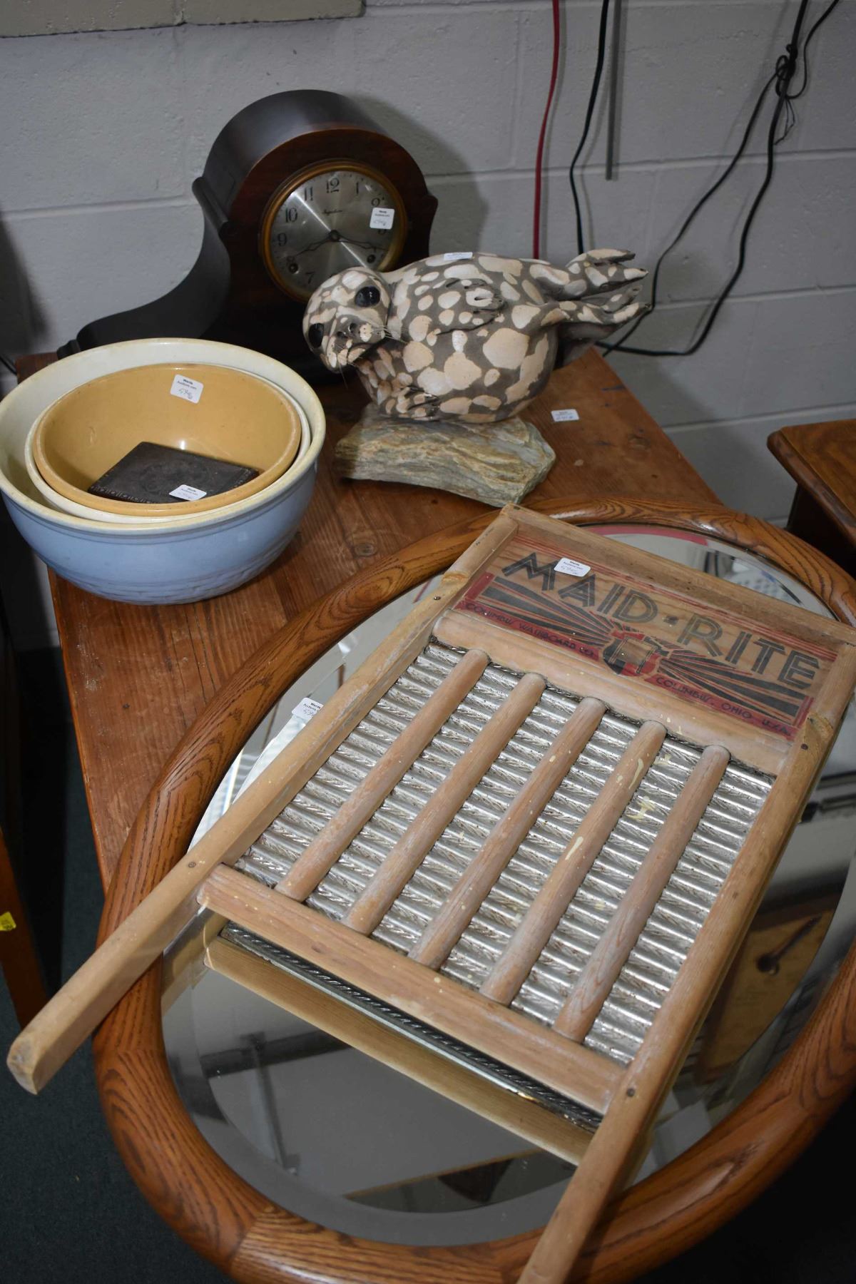 Selection of collectibles including three stoneware mixing bowls including Medalta, an oak framed bevelled wall mirror and Maidrite washboard, top hat clock etc.