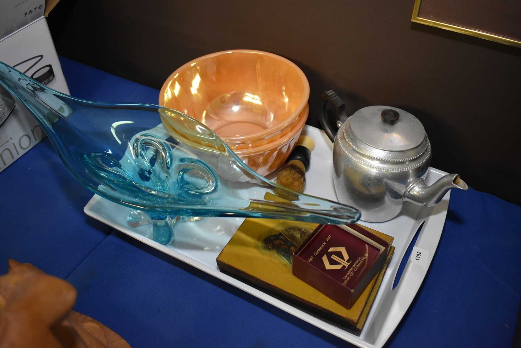 Selection of collectibles including two Fireking mixing bowls, 1970's blue art glass bowl, aluminium teapot, two wooden wall plaques etc.