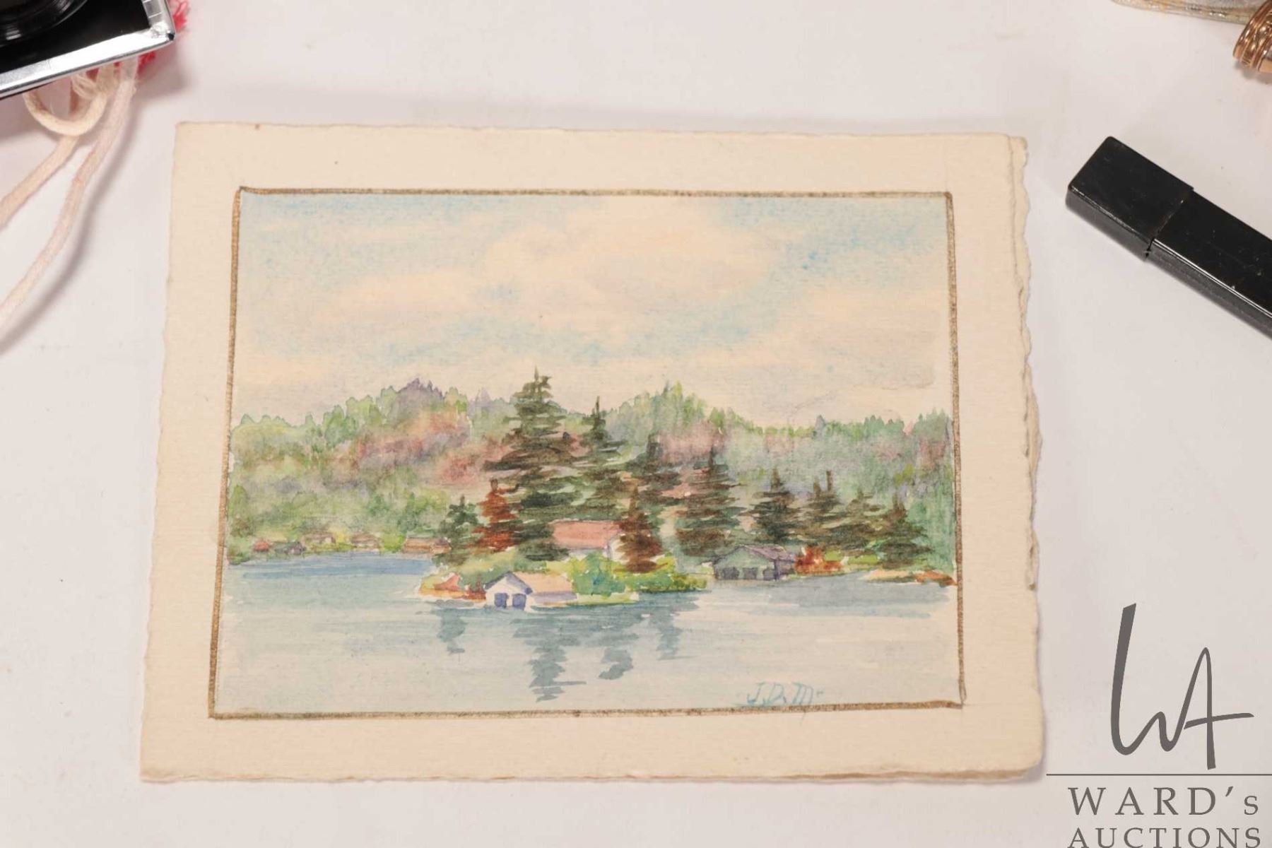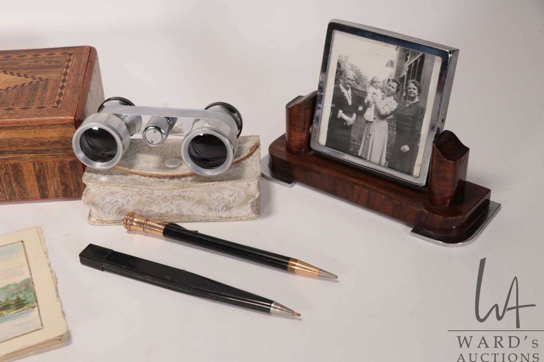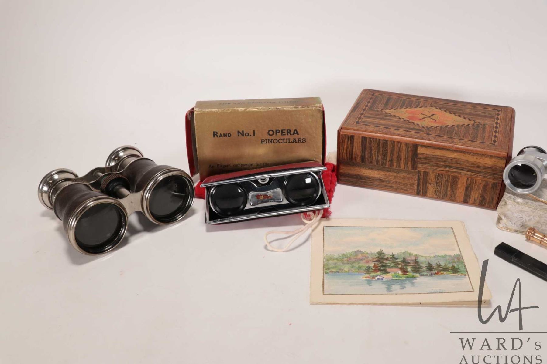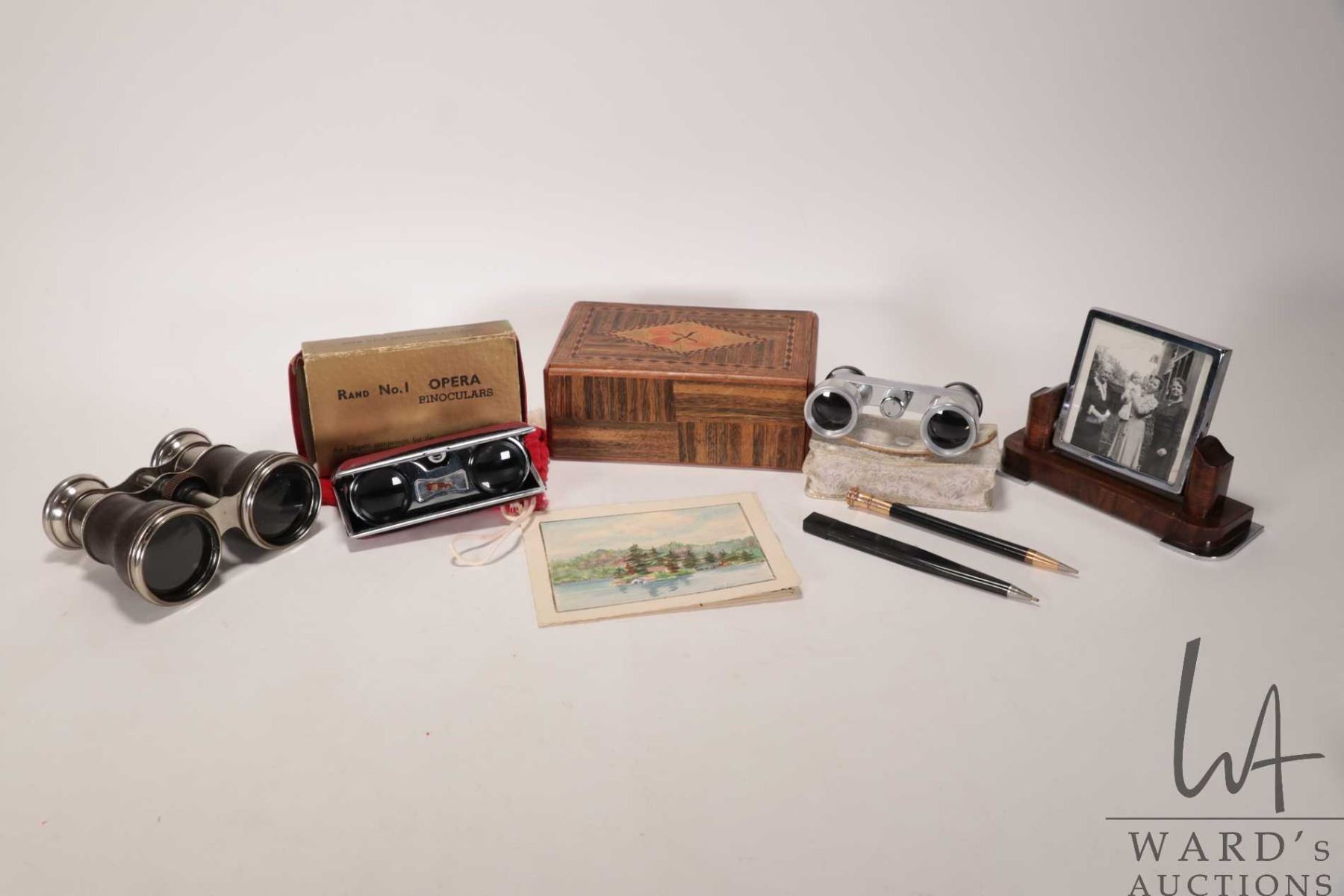 Selection of collectibles including two boxed sets of opera glasses and a Paris binoculars, small tabletop picture frame, a gold plated pen, marquetry puzzle box and a small hand made watercolour card