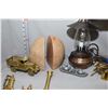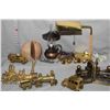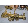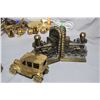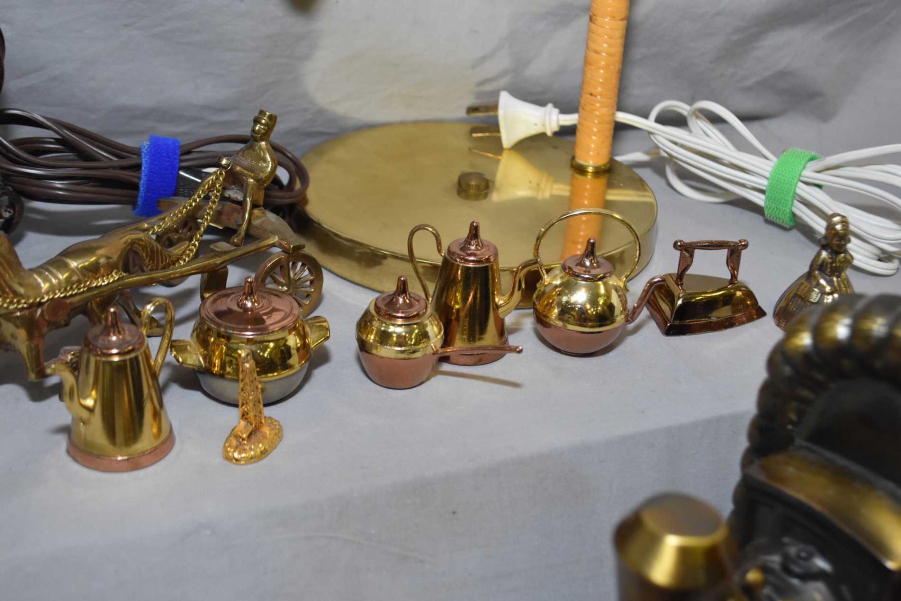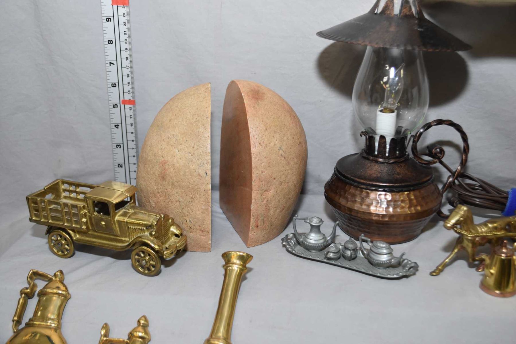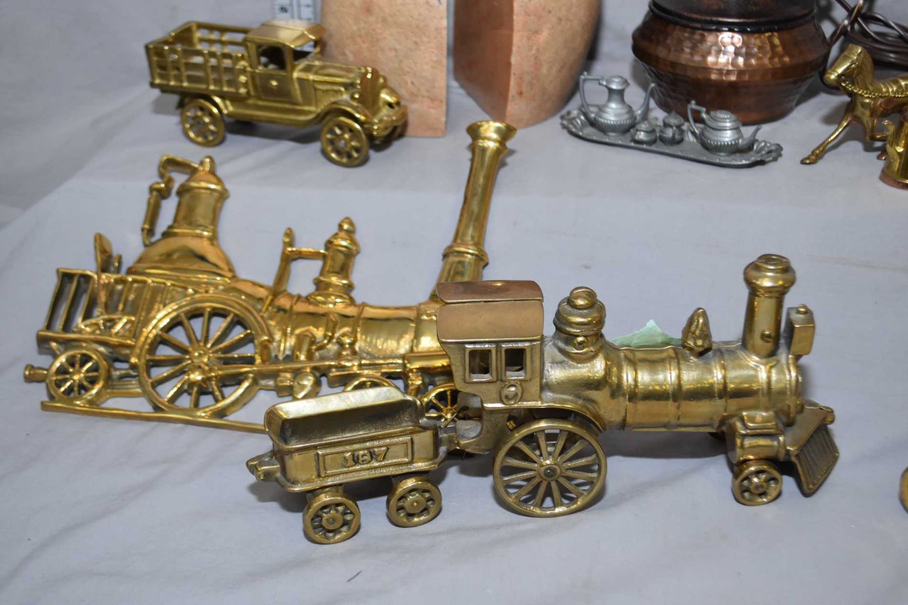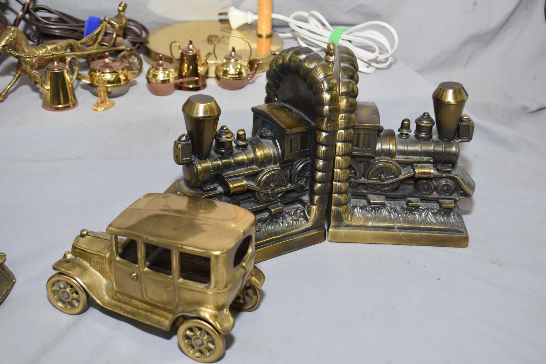 Selection of collectibles including two brass cars, a set of locomotive bookends and small metal miniatures plus two lamps including desk lamp etc.