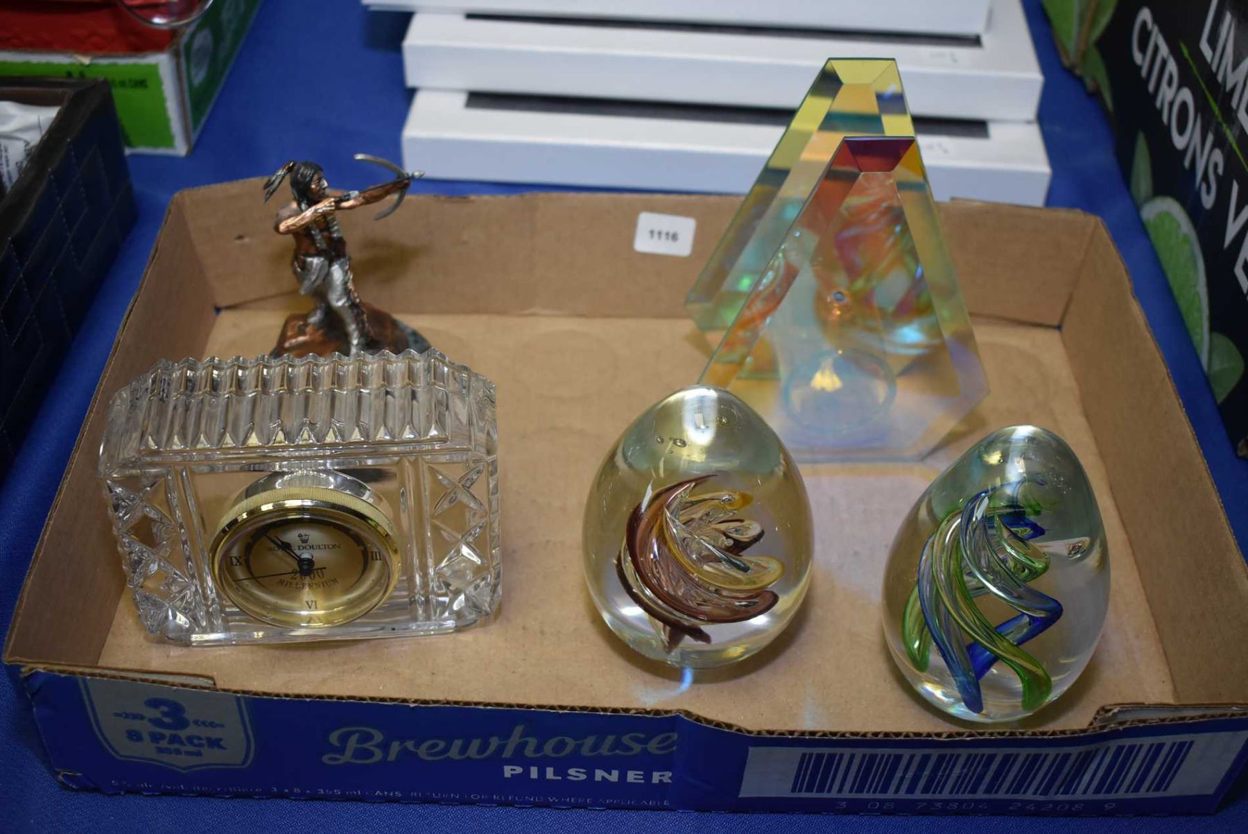 Selection of collectibles including two hand blown paperweights, a limited edition metal warrior on marble base, Royal Doulton mantle clock etc.