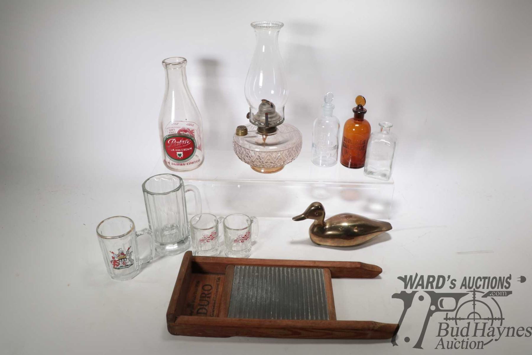 Selection of collectibles including vintage clear glass oil lamp w/ hurricane, DURO mini washboard, four vintage collectible bottles, brass duck, etc