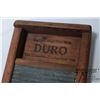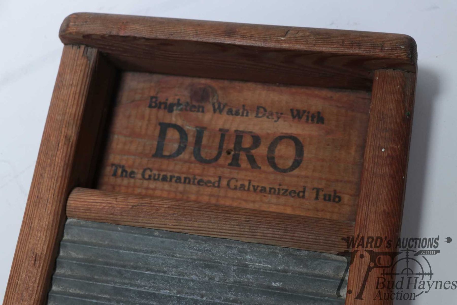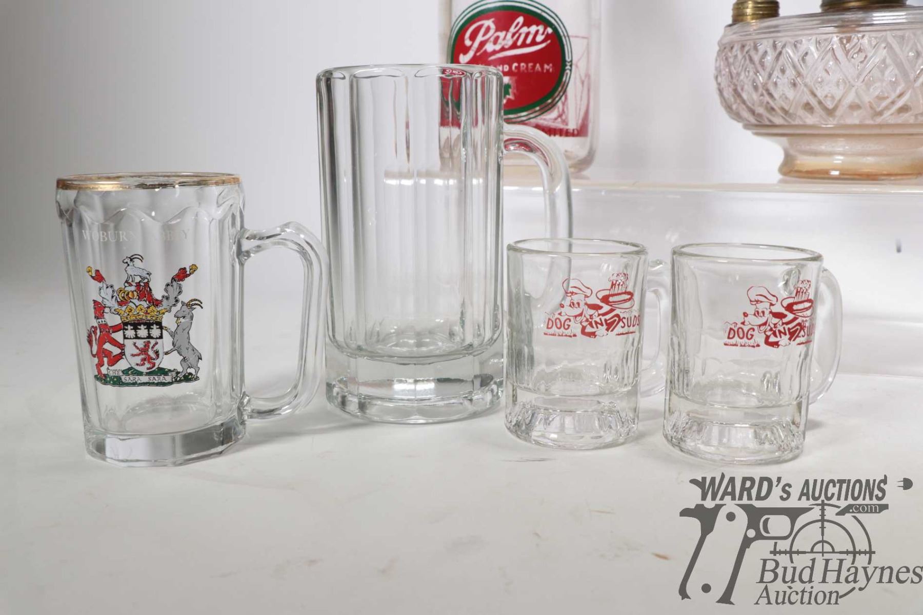 Selection of collectibles including vintage clear glass oil lamp w/ hurricane, DURO mini washboard,