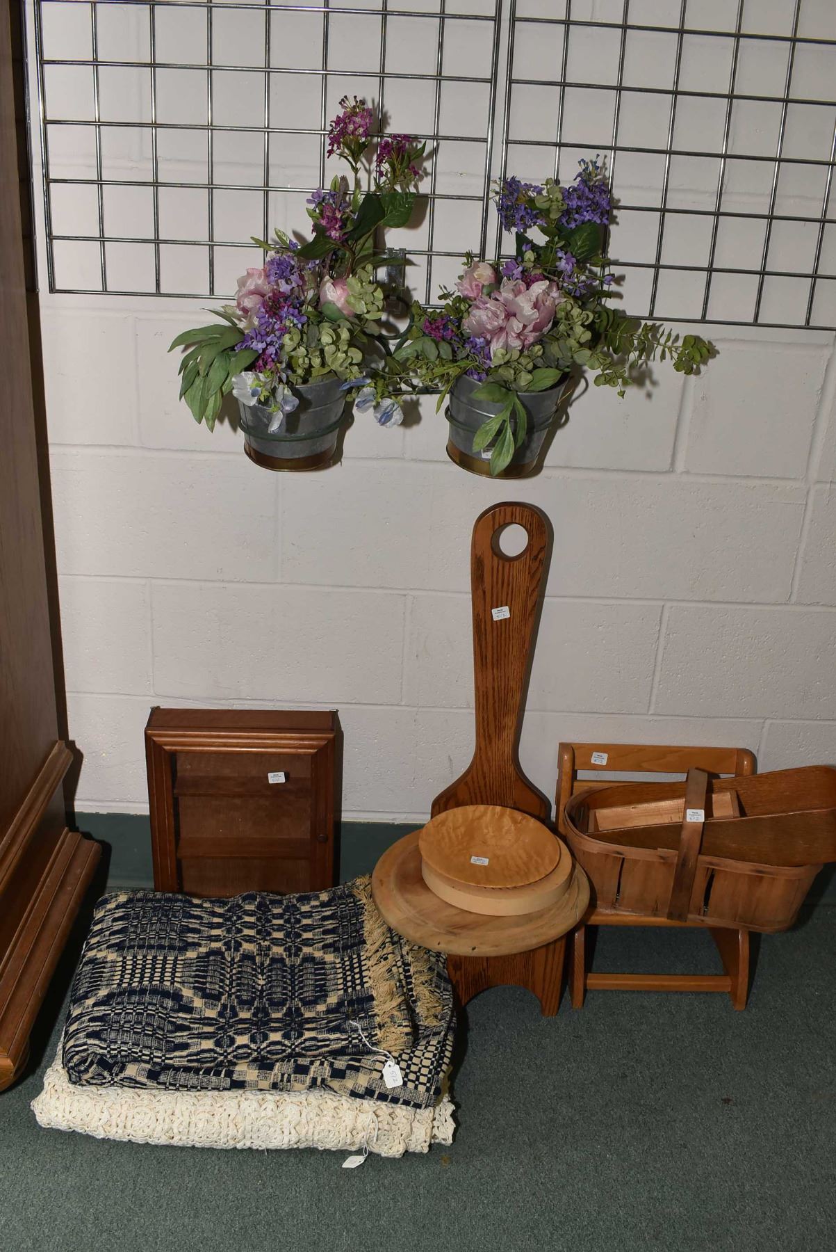 Selection of collectibles including wooden stool, apple basket, vintage handmade bed coverlet, vintage woven blanket, wall mount cabinet etc.