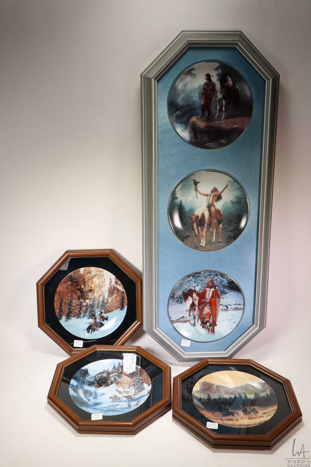 Selection of collector plates including triple framed Hamilton Collection including Mystic Warrior, The Last Warrior and Prideful Ones plus three individually framed plates, all from the Faces of Nature series. Note: Not available for shipping. Local pickup only