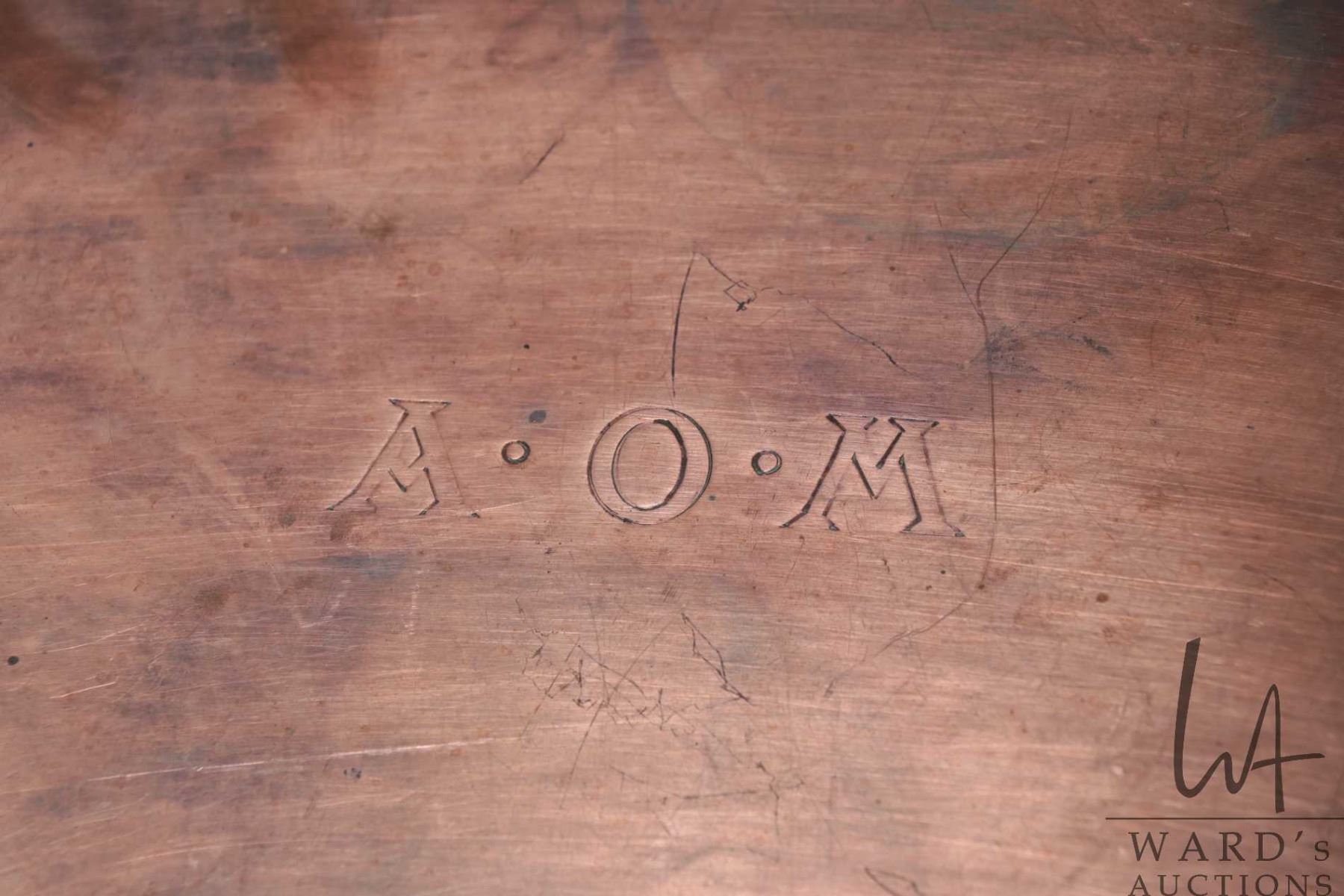 Selection of copper including teaset purportedly belonging to Annie Olivia Tiffany Mitchell ( 1844-1937) daughter of Charles Tiffany ( 1817-1902) founder of Tiffany & Co. New York . The tray is monogrammed "AOM" as are some of the pieces. Appears to have once been silverplate on copper.