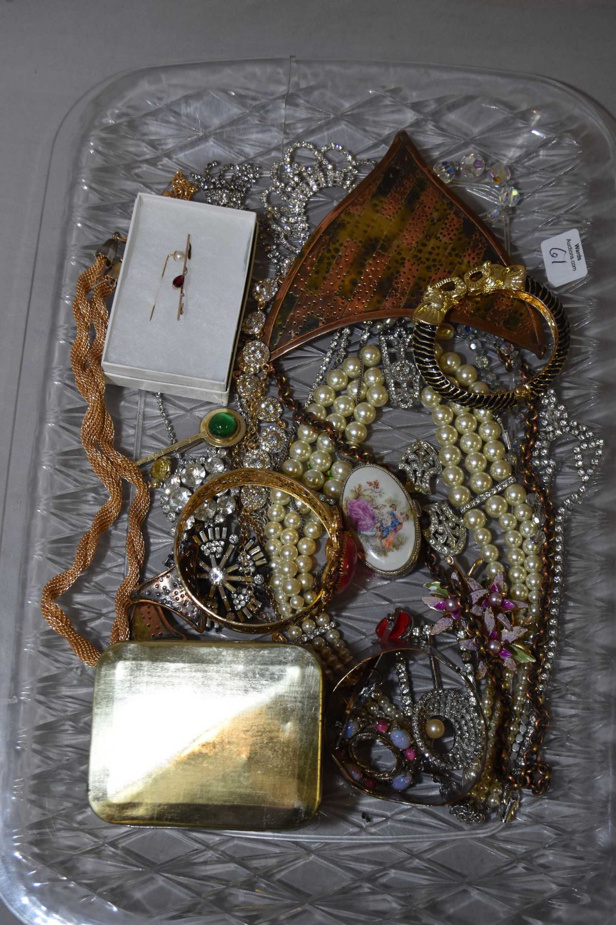 Selection of costume jewellery including diamante necklaces, 10kt gold and gemstone brooch, a 14kt gold and genuine pearl pin, faux pearls, earrings, selection of Mah-jong pieces etc.