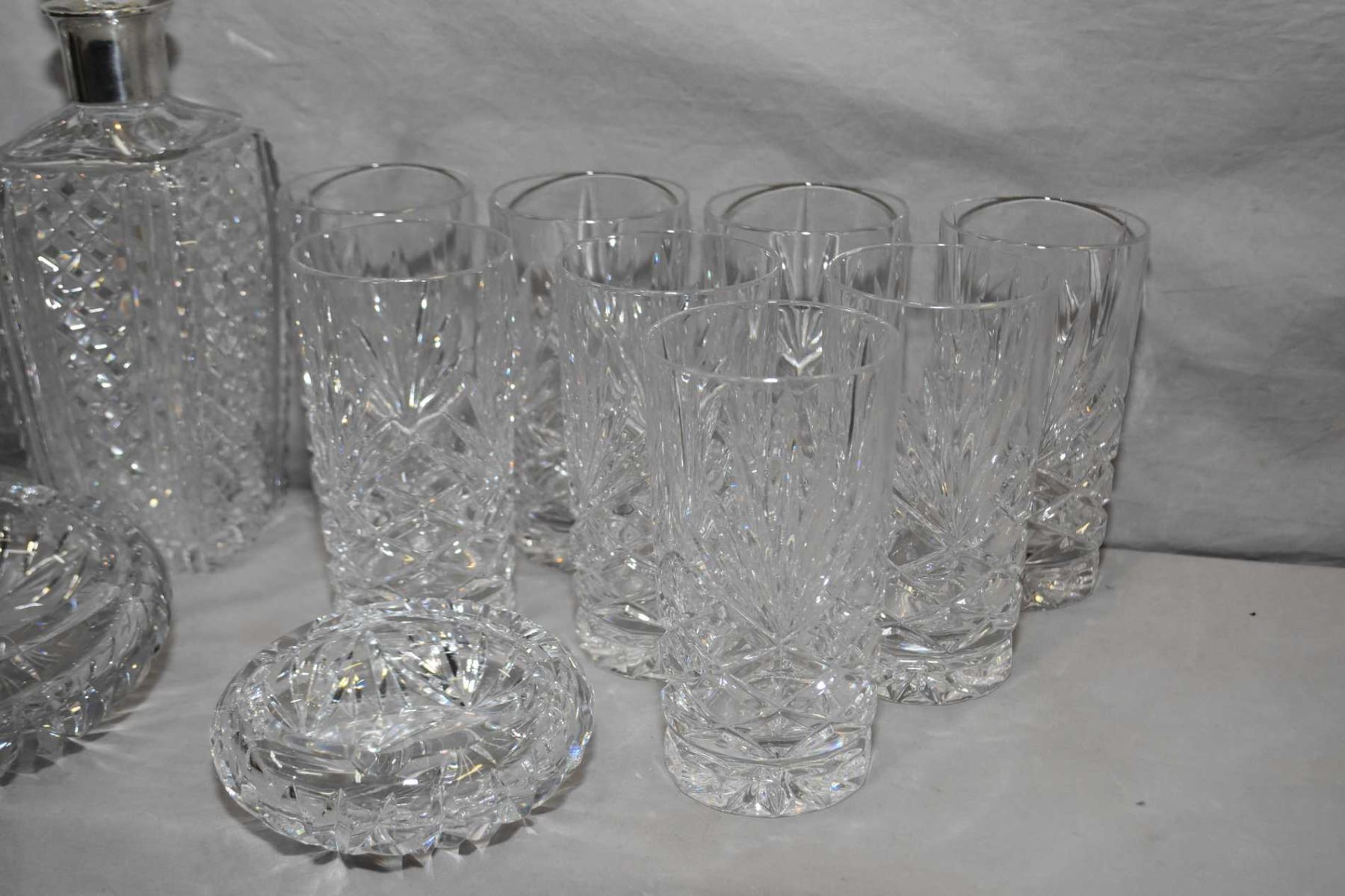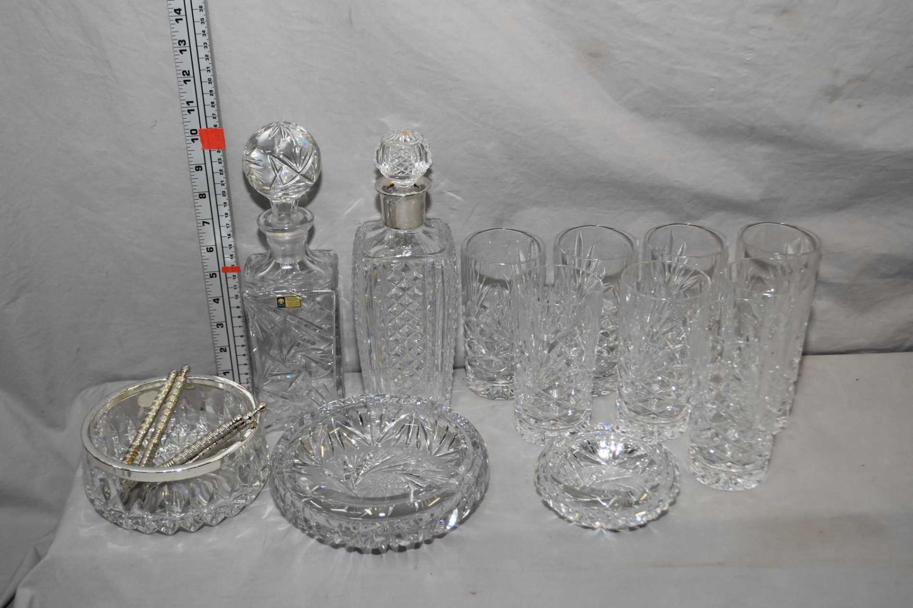 This item is not available for shipping. Local pickup only. Selection of crystal including decanter with Birks silver collar, pinwheel drinks decanter plus eight hi-ball glasses, nut dish and two ashtrays