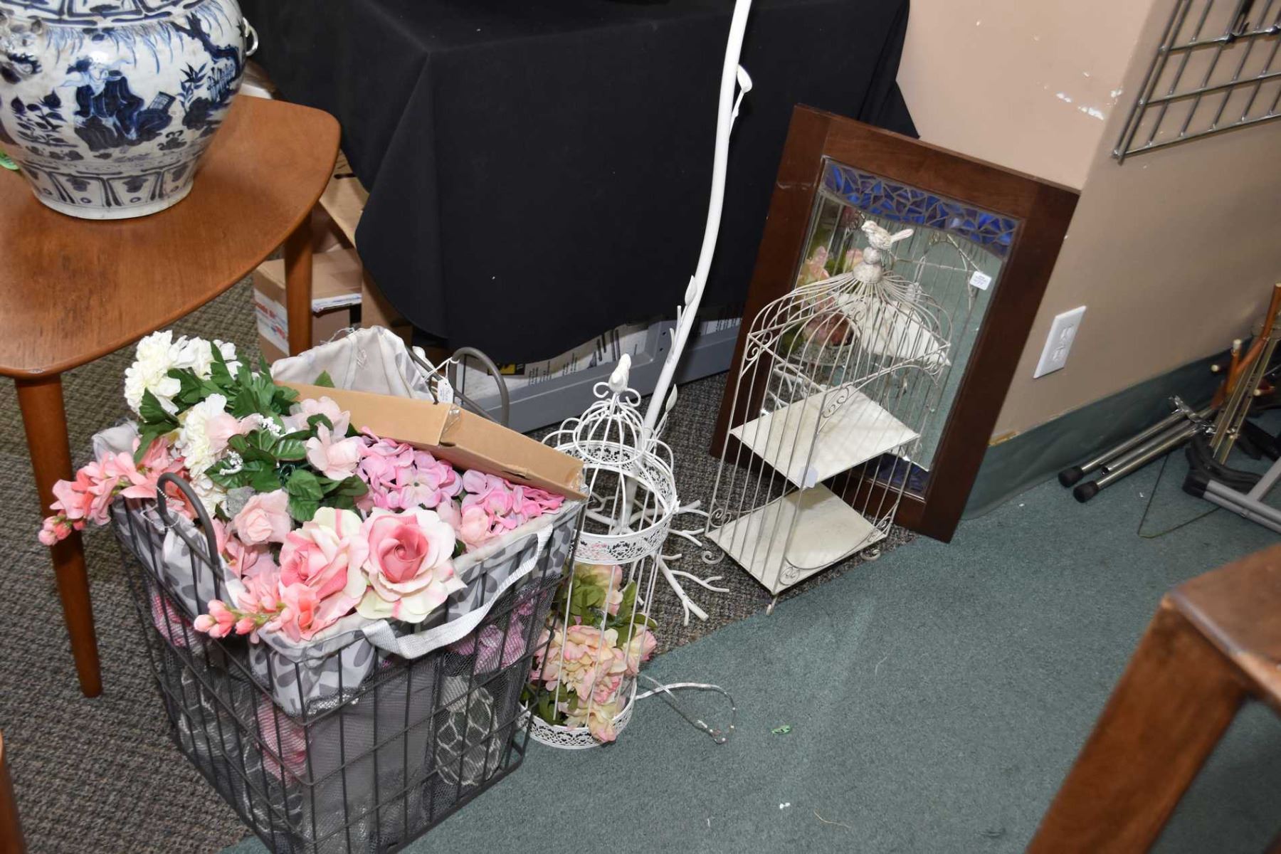 Selection of decor items including bird cages, faux flowers, handled basket and contents, wall mirror with leaded glass etc. NOTE: Not available for shipping. Local bidders only