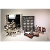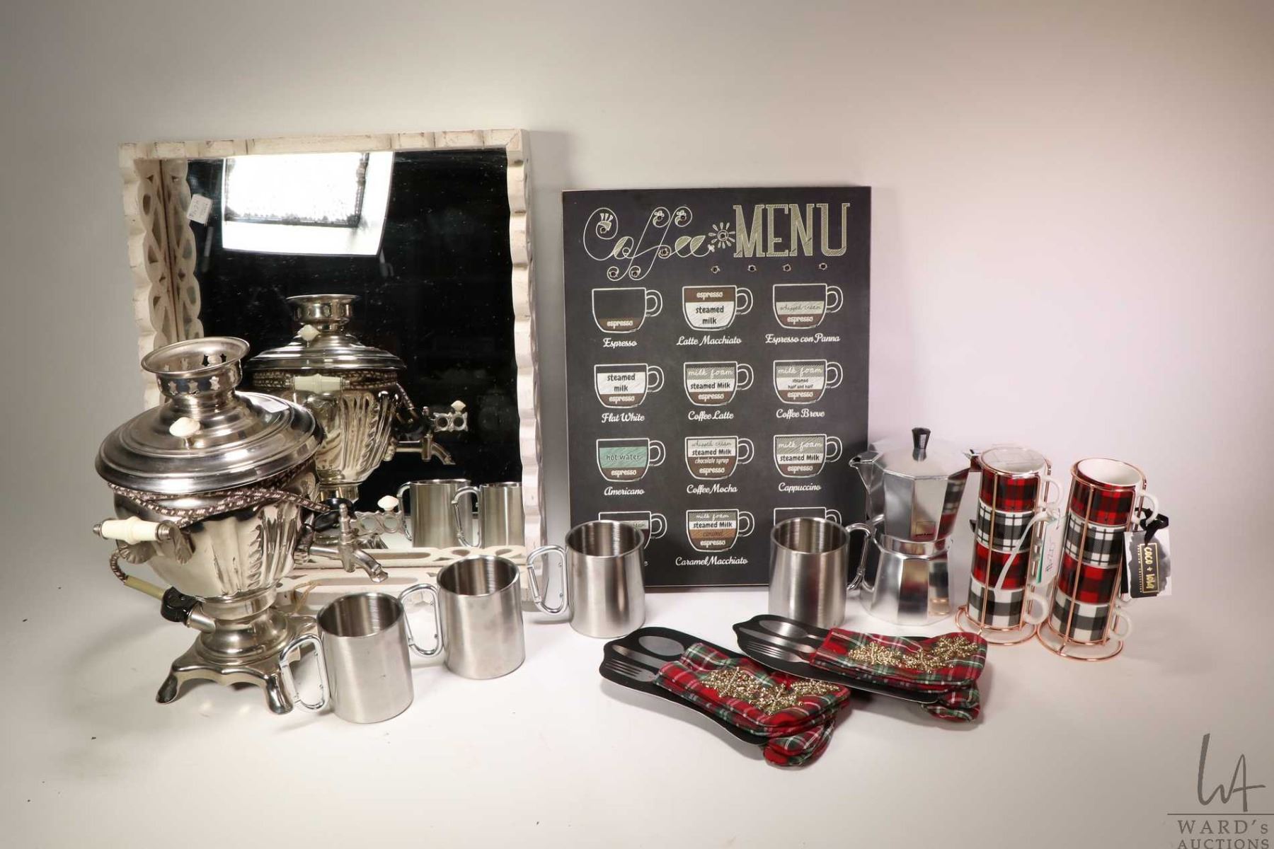 Selection of decor items including eight stacking espresso cups in copper galleys, Italian style coffee maker, four aluminium coffee cups and a vintage samovar plus a mirrored tray and a light up coffee menu