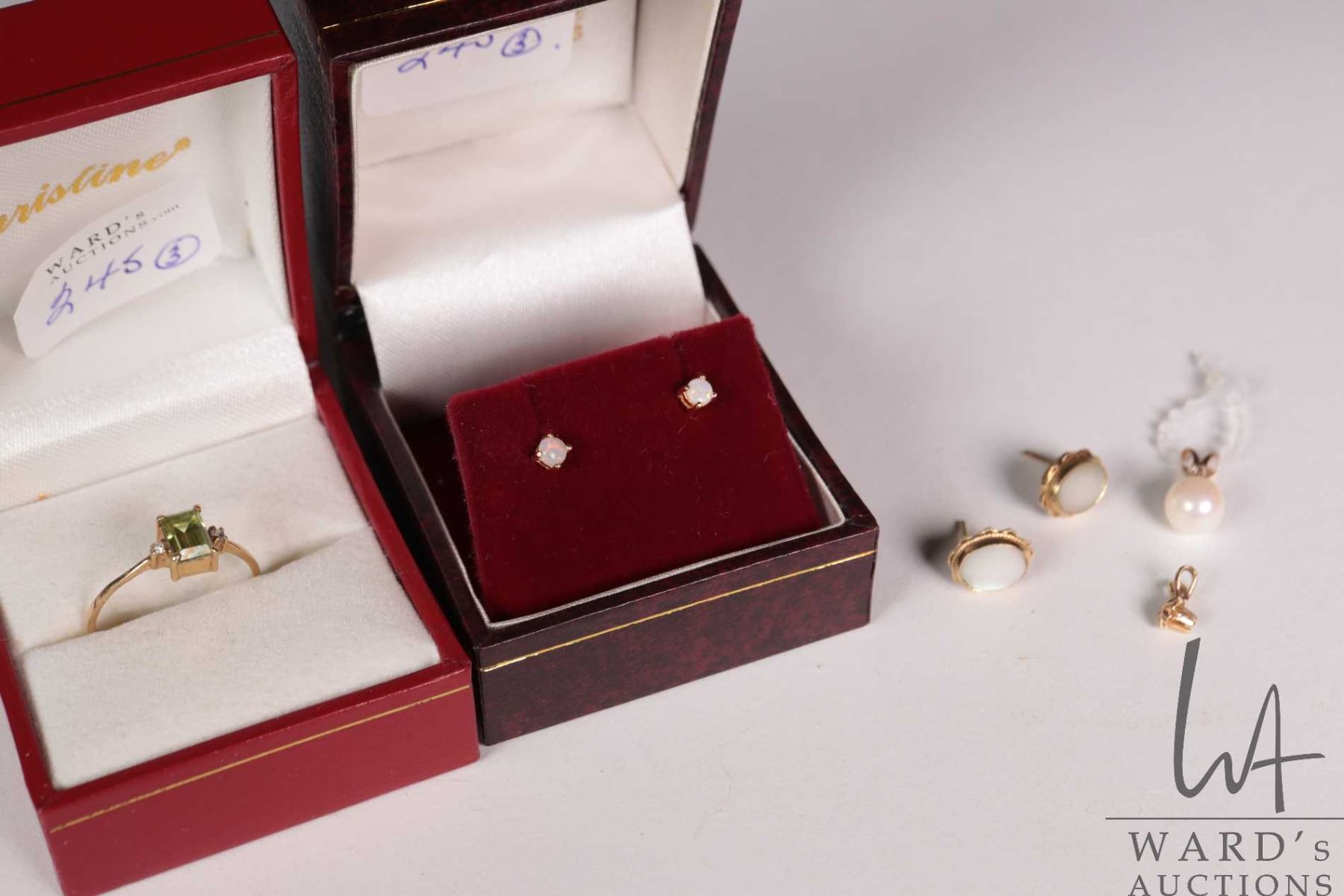 Selection of delicate 10-14kt yellow gold jewellery including tested 14kt yellow gold and peridot gemstone ring, 14kt gold and opal earrings, genuine pearl and diamond pendant and tiny diamond pendant
