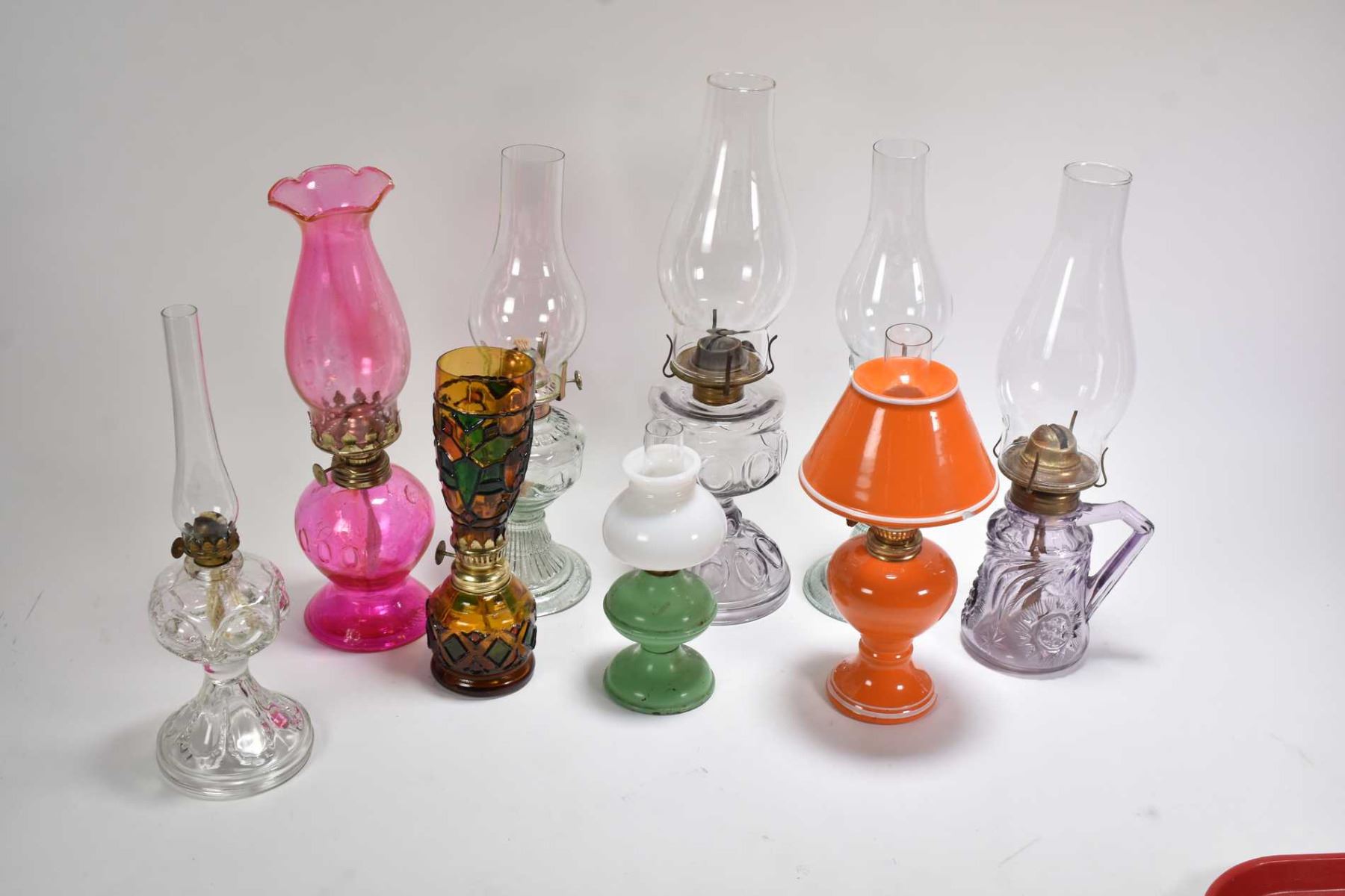 Selection of diminuitive glass oil lamps including finger lamps, some turning purple, lamps with shades etc. Not available for shipping. Local pickup only