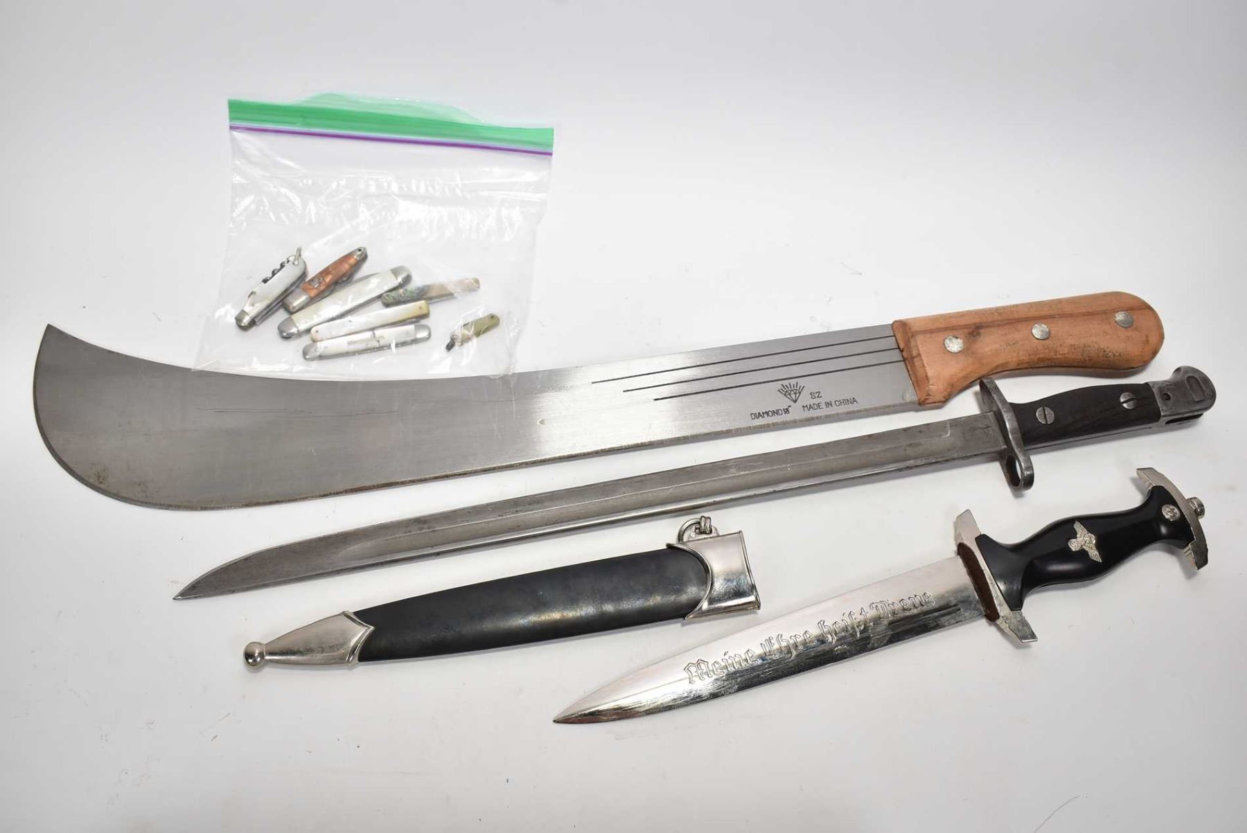 Selection of edged weapons including a bayonet, a machete, reproduction Nazi dagger and a selection of vintage pocket knives