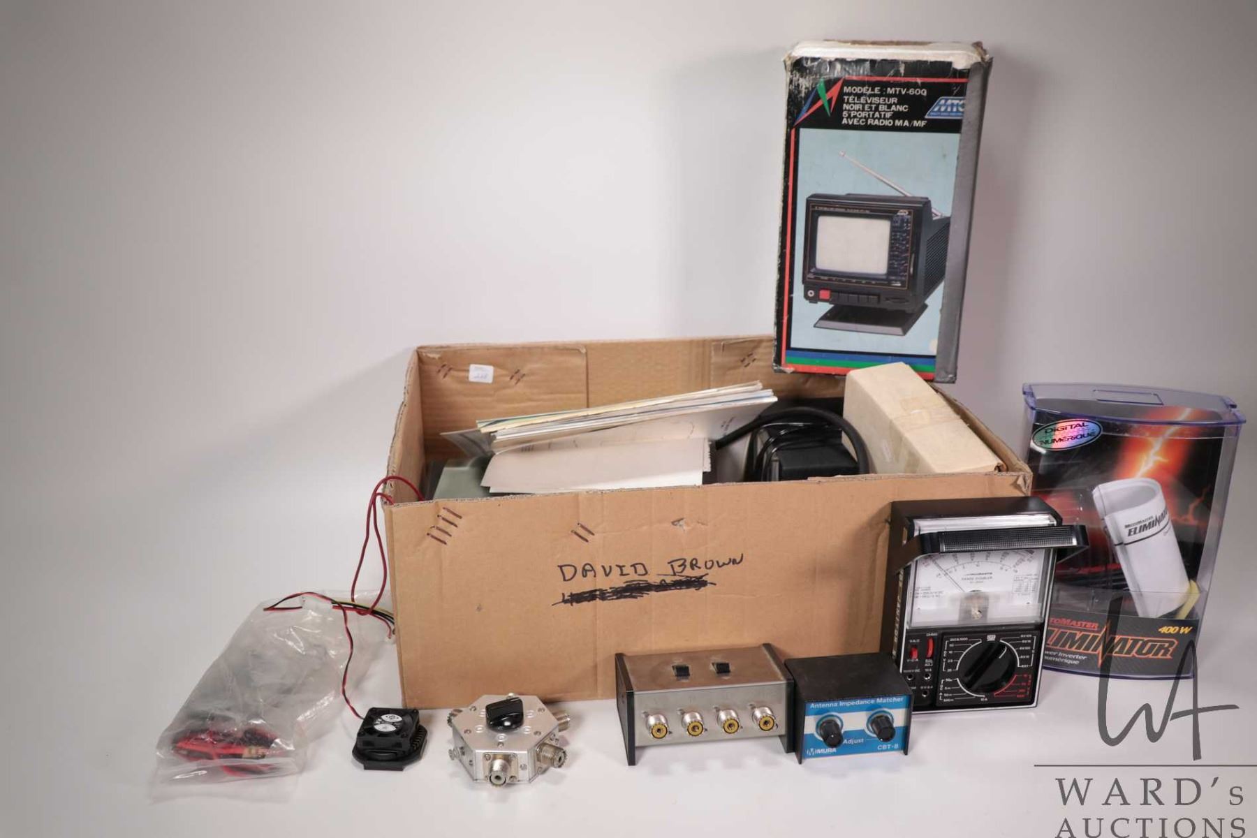Selection of electronics including Micranta multi-meter, BK Precision 2800 multi-meter, MTC model MTV-600 5" portable television with original box, assorted switches etc.