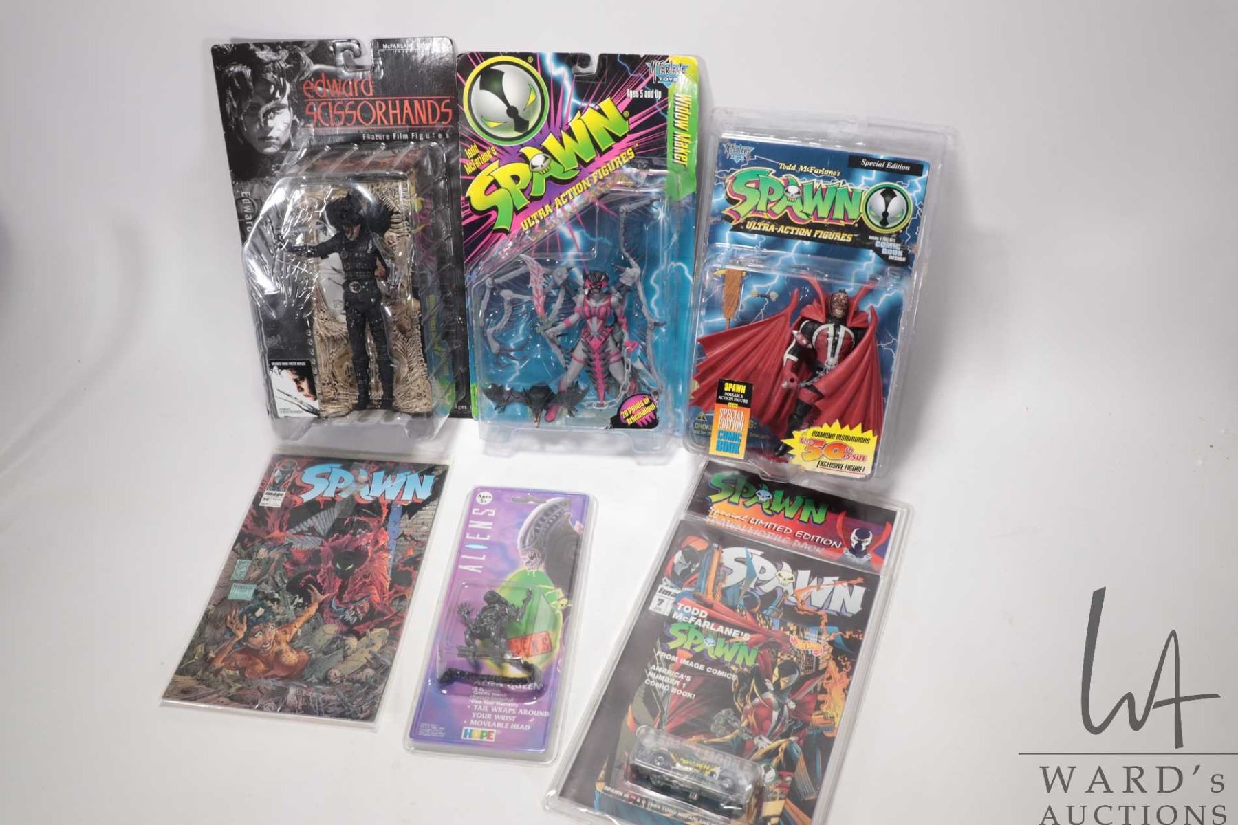 Selection of figurines including Spawn, Widow Maker, Edward Scissor hands, Aliens, plus Spawn car & comic and Spawn comic