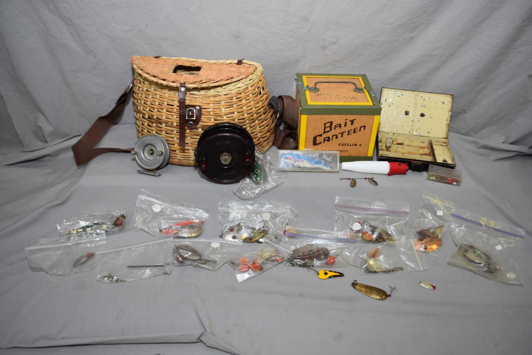 Selection of fish collectibles including fish basket, bait box and two reels, small fly kit plus assorted vintage lures and leaders