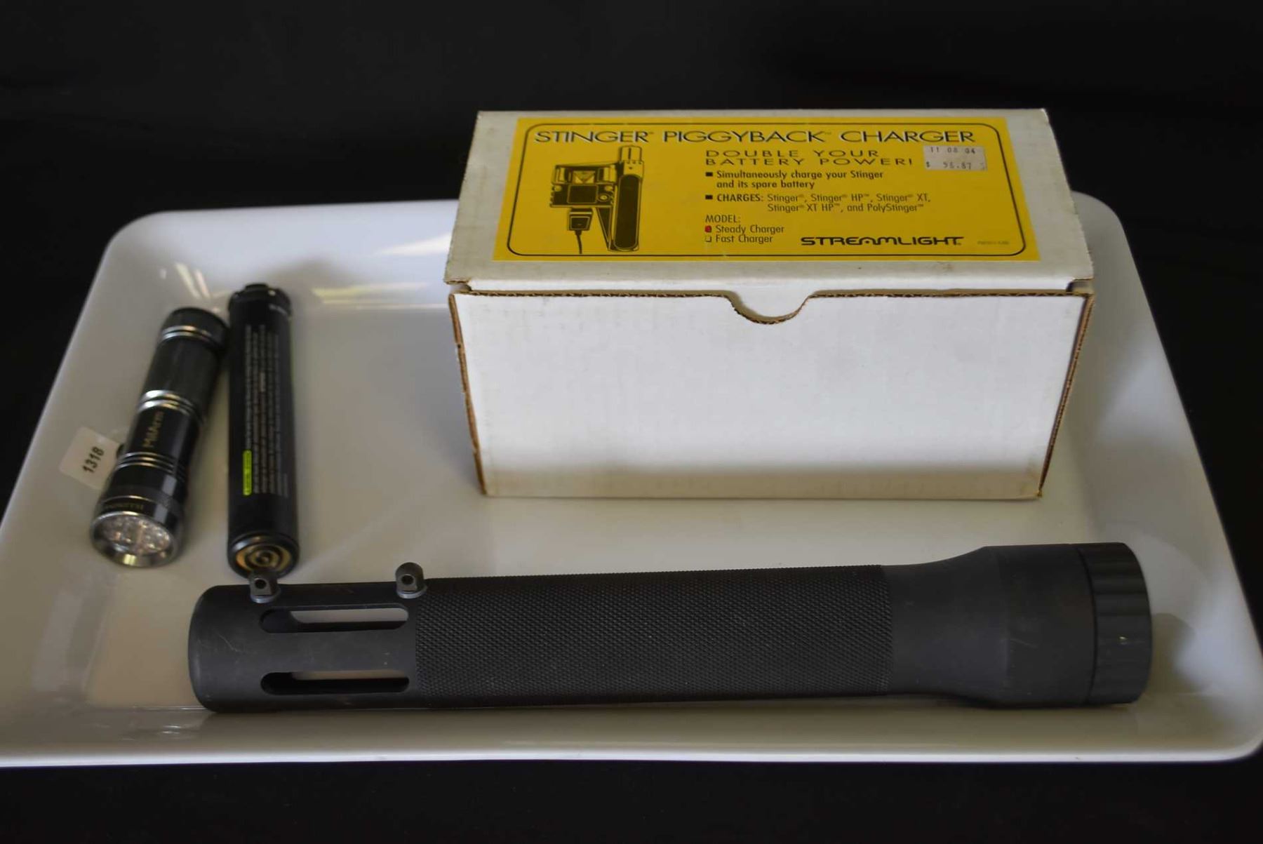 Selection of flashlight accessories including a 5.11 Tactical triple "A" cell adapter, aluminium flashlight housing, a new Streamlight Stinger piggy back steady charger etc.