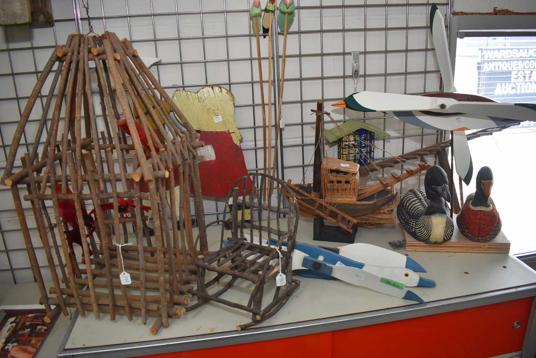Selection of folk art including windmills, bird cage, doll's rocker, boat etc. plus and antique wood
