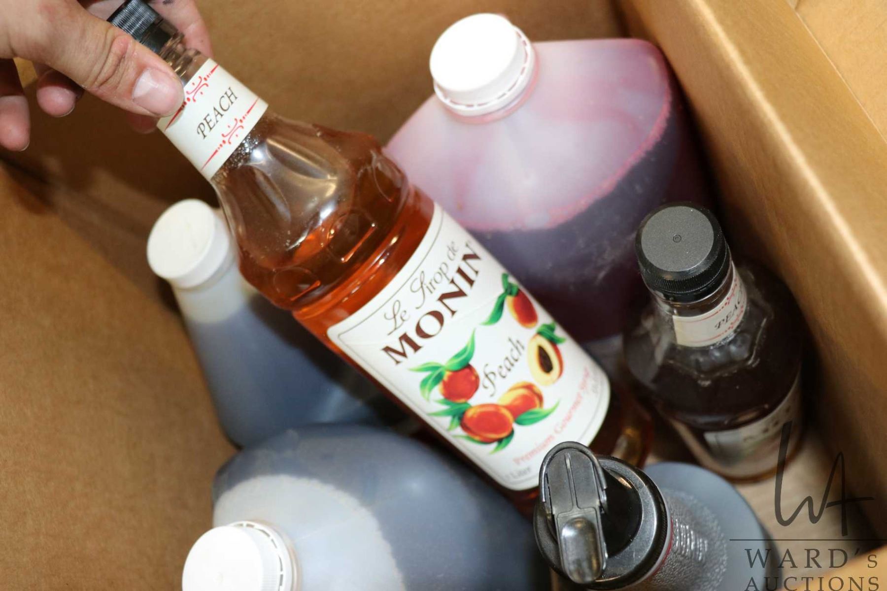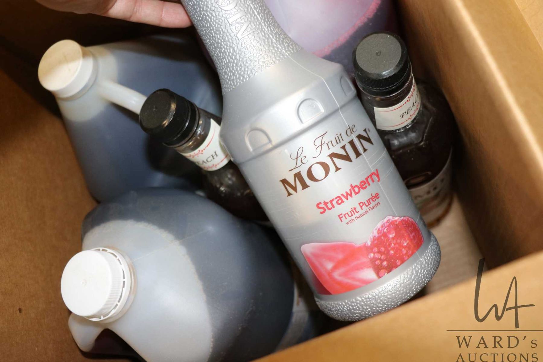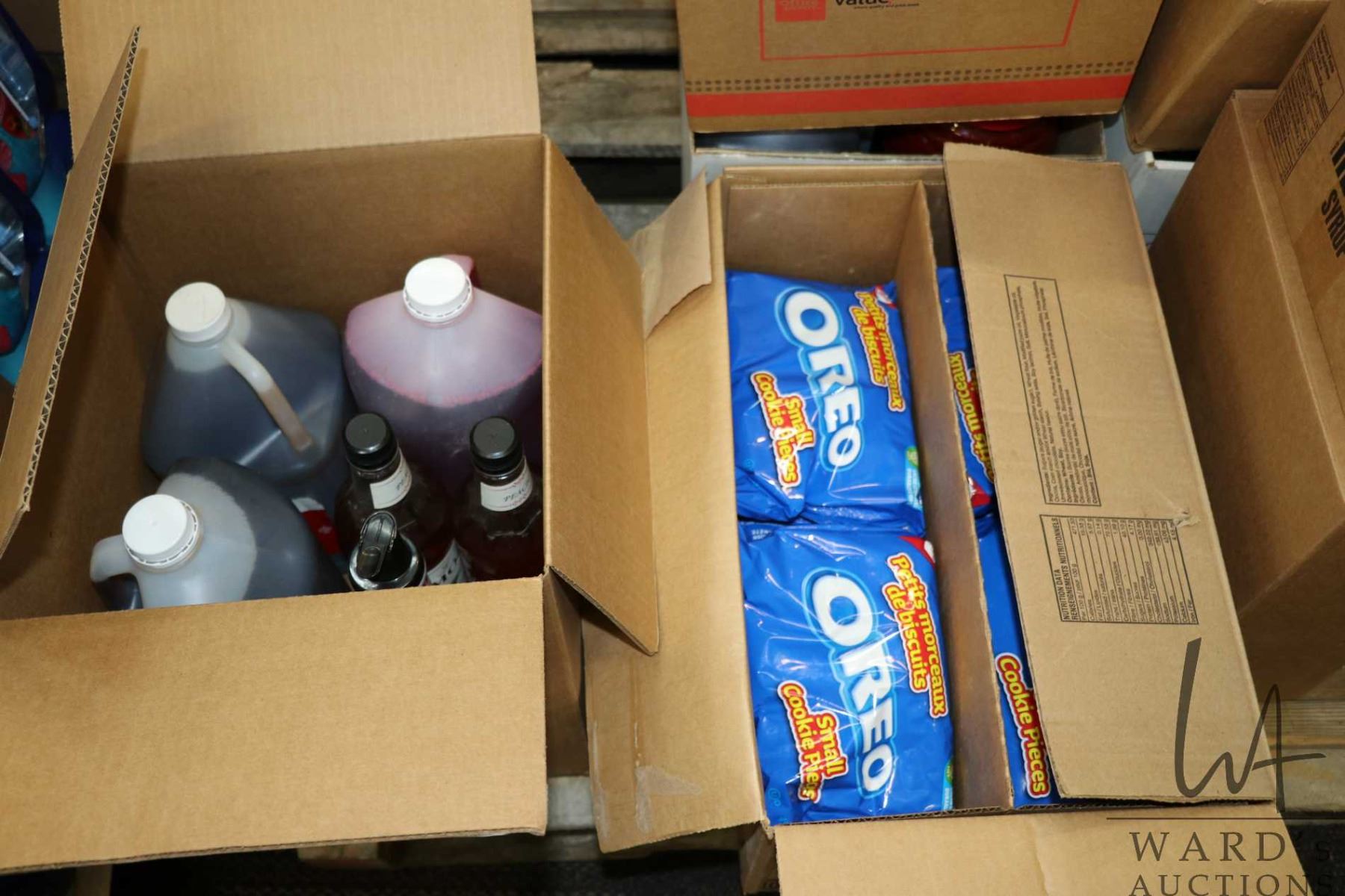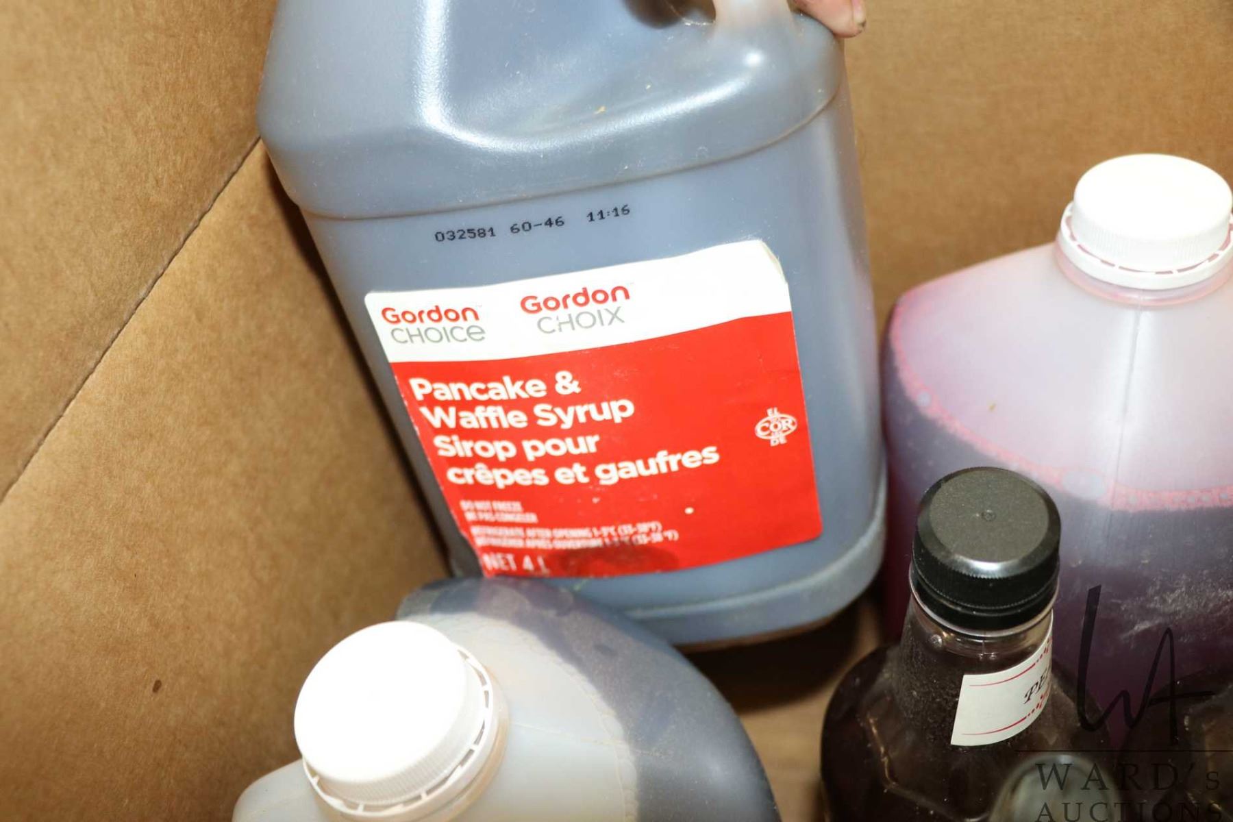 Selection of food items including 4L jug of Richardson strawberry syrup, 4L jug of Richardson vanill