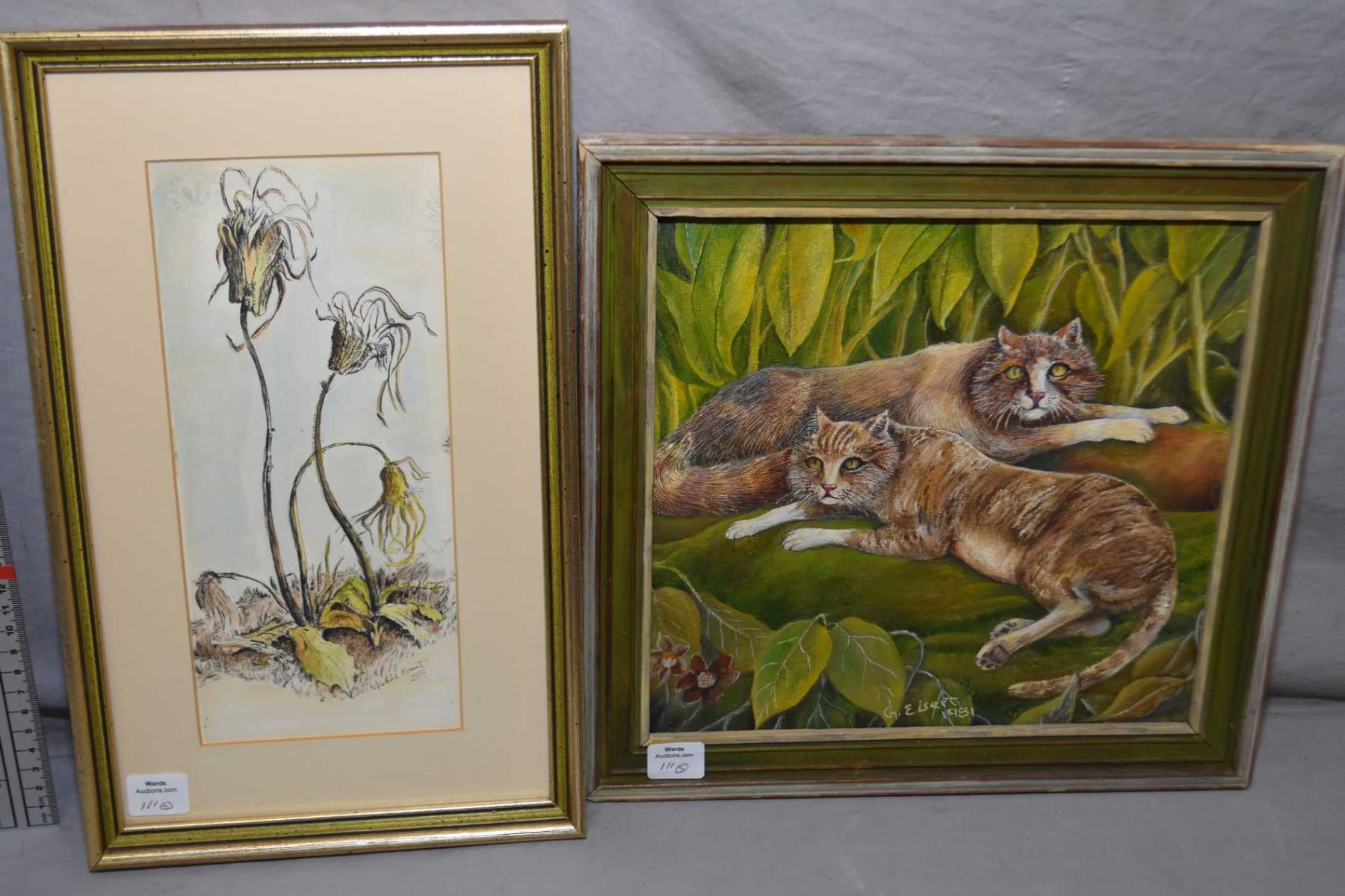 Selection of four framed cat motif pictures including original acrylic on canvas cats in a jungle signed by G. Eisert 10" X 10" and a print of dandelion flowers