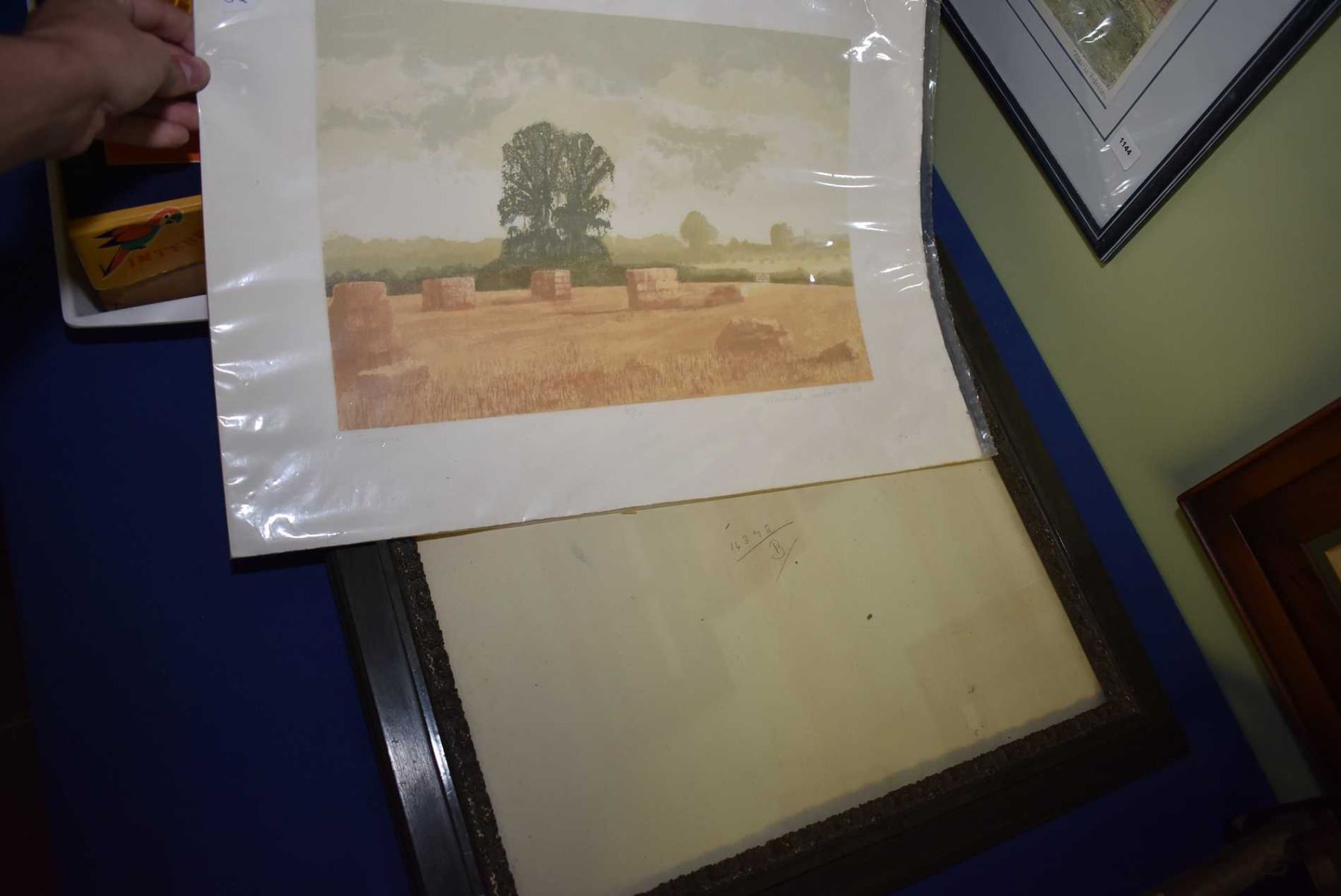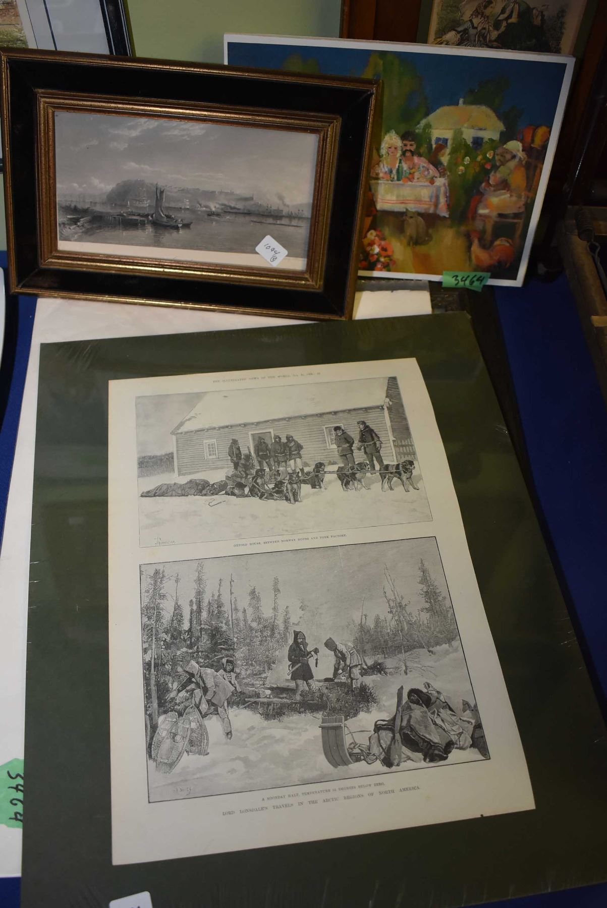 Selection of framed and unframed prints including 1890 Illustrated News of the World, an etching of ships in a harbour etc.