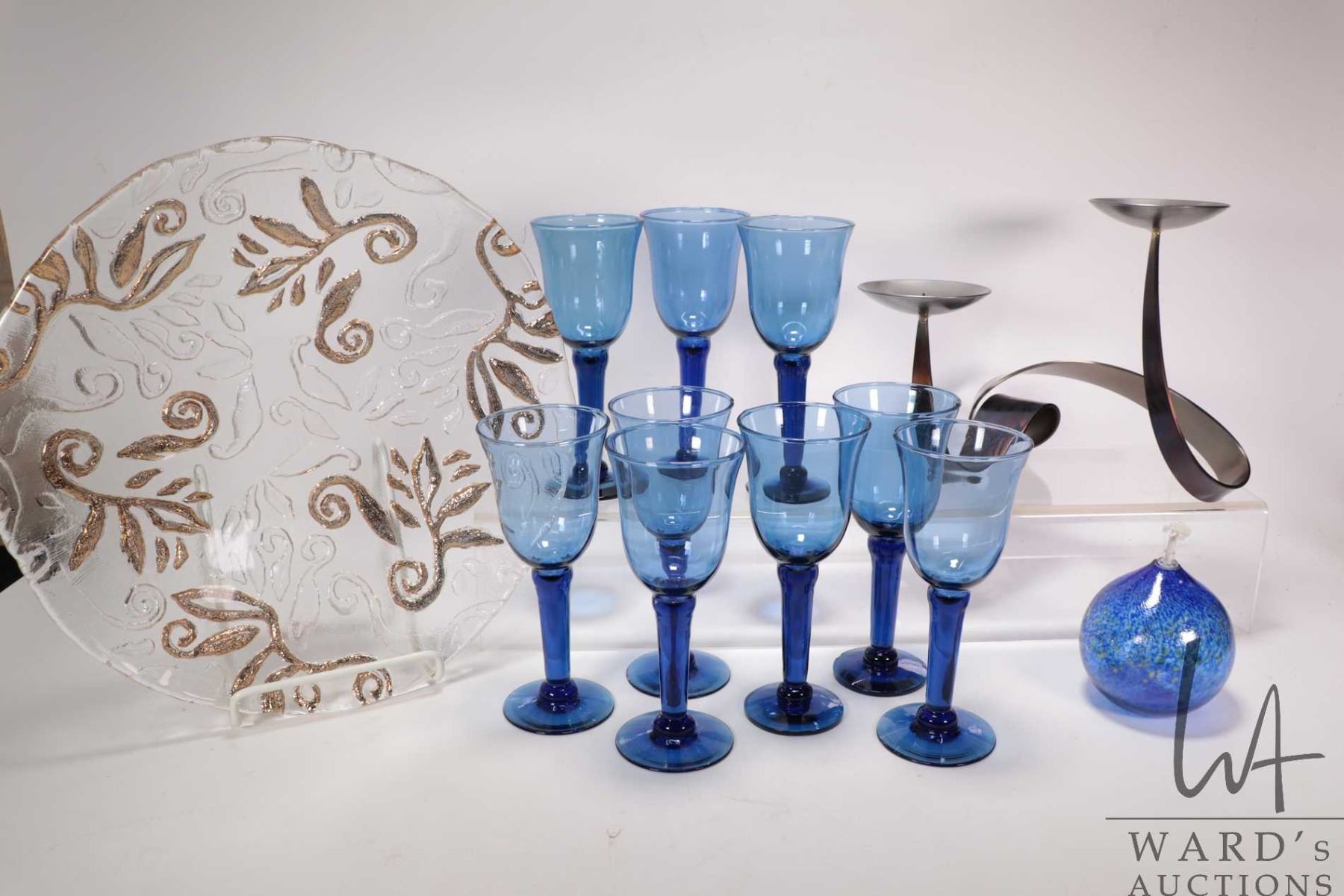Selection of glasswares including nine 8" high goblets, hand painted IVV Italian made charger, Martha Henry signed art glass oil candle plus a two branch, artisan made Ferart metal candlesticks. Note: No shipping for this lot. Local pickup only