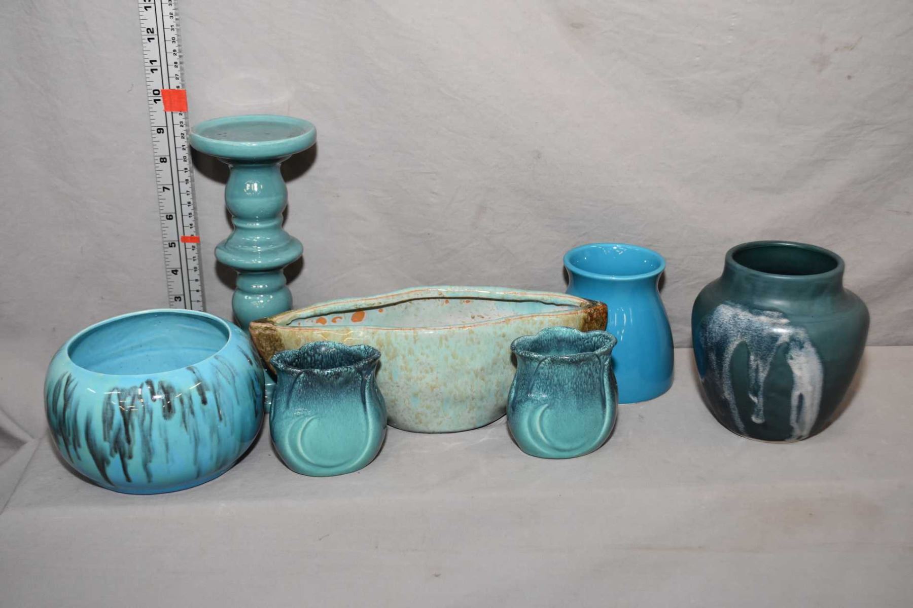 Selection of glazed pottery including candlestick 9  in height, assorted vases and bowls